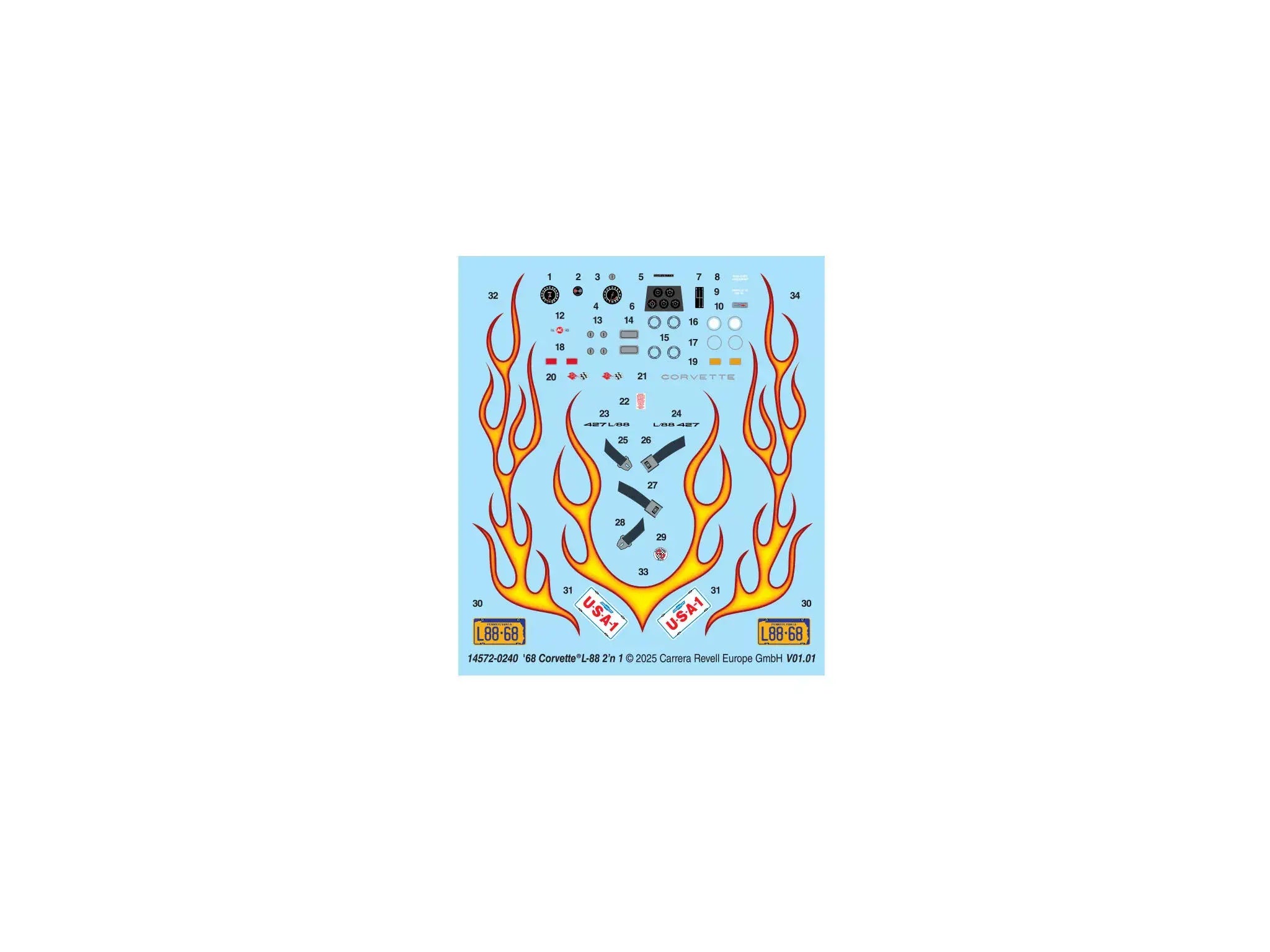 The 1968 Corvette was dramatically redesigned with curvaceous lines inspired by Chevrolet’s Mako Shark II dream car. The ultimate ’68s were powered by the mighty L88 version of the legendary 427-cubic-inch big-block V-8. The race-ready mill was good for an estimated 500 horsepower and was installed under a specially designed high-rise hood not shared with lesser Corvettes. This carefully detailed Revell kit includes parts to build a factory-stock ’68 Corvette convertible with the L88 mill or a wild street machine with a blown-and-injected 427 V-8 poking through the hood, a pair of chrome side pipes, and custom wheels.