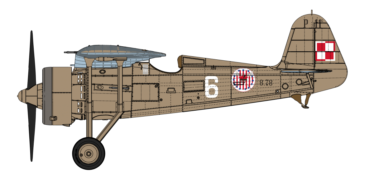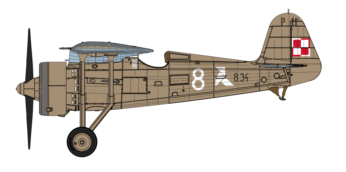 After succesful P.11a and P.11b versions, in 1933 and 1934 PZL manufacturer has developed an improved version of the fighter, with a redesigned hull and tail, newer Bristol Mercury V engine version, and a possibility of placing the armament inside a wing. Engine cowling was lowered to improve pilots field of view. Changes in fuselage construction included extension of truss to the end of the cockpit in the way that the semimonocoque construction started behind the pilot’s seat. 175 of these aircraft were ordered by Polish Air Force and the construction started in 1934. Most of the order was delivered in 1935, last planes finished in 1936.