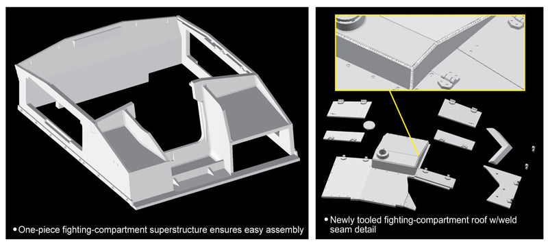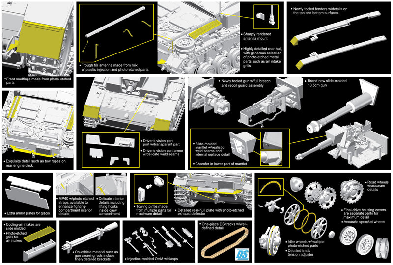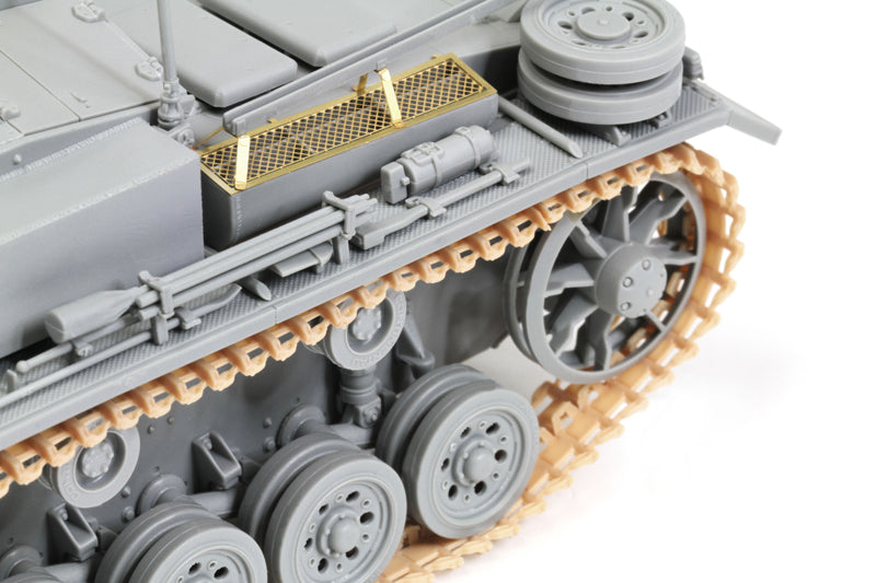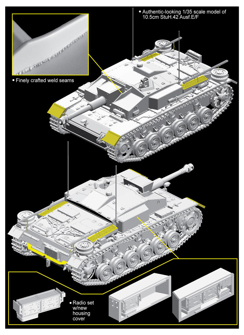 The latest offering from Dragon represents a stunning 1/35 scale kit of an StuH.42 self-propelled howitzer based on a StuG.III Ausf.F chassis. This kit is cleverly based on Dragon’s highly sought-after StuG.III kits, but it incorporates completely new elements such as a retooled superstructure roof and fighting compartment. The front fenders are also brand new, and they are made from photo-etched metal to give maximum realism. Dragon’s StuG.III family in 1/35 scale was already impressive enough, but the line-up has just gained even more firepower with this fine rendering of a StuH.42 Ausf.F with larger-caliber gun!