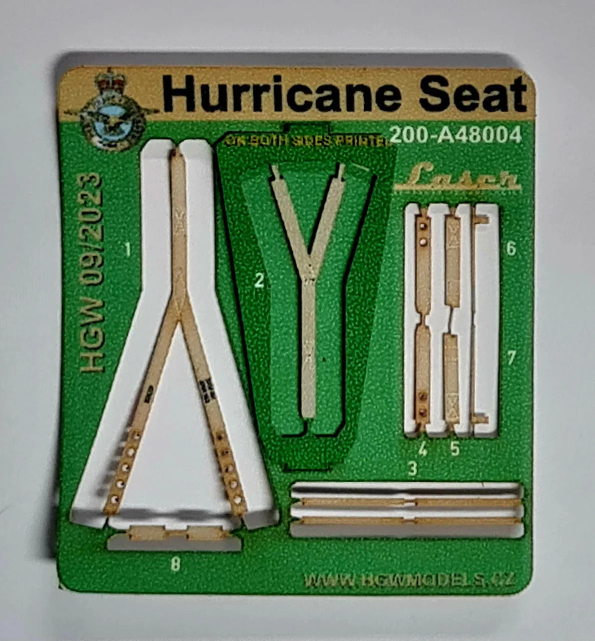 Ultra high printing quality of the seat, two different transparent gun sights, textil seat belts and photoetched buckles with HGW Model cooperation for 1/48 Hawker Hurricane. Recommended kit Arma Hobby, but can be used for any other plastic kit of other producer.