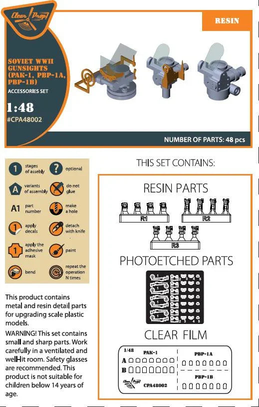 The Clear Prop WWII Soviet Gun Sights set (Part #A48002) is a precision photo-etched brass and resin detail upgrade designed for 1/48 scale Soviet WWII aircraft models. This comprehensive set includes three authentic Soviet gunsight types: PAK-1, PBP-1A, and PBP-1B, allowing modelers to add exceptional cockpit detail and historical accuracy to their builds.