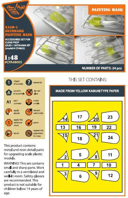 This precision-cut paint mask from Clear Prop is specifically designed for the 1/48 scale XA2D-1 Skyshark model kit. Made from high-quality yellow Kabuki paper, this double-sided painting mask ensures crisp, clean paint lines and professional-quality finishes on your scale model aircraft.