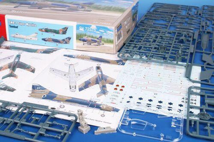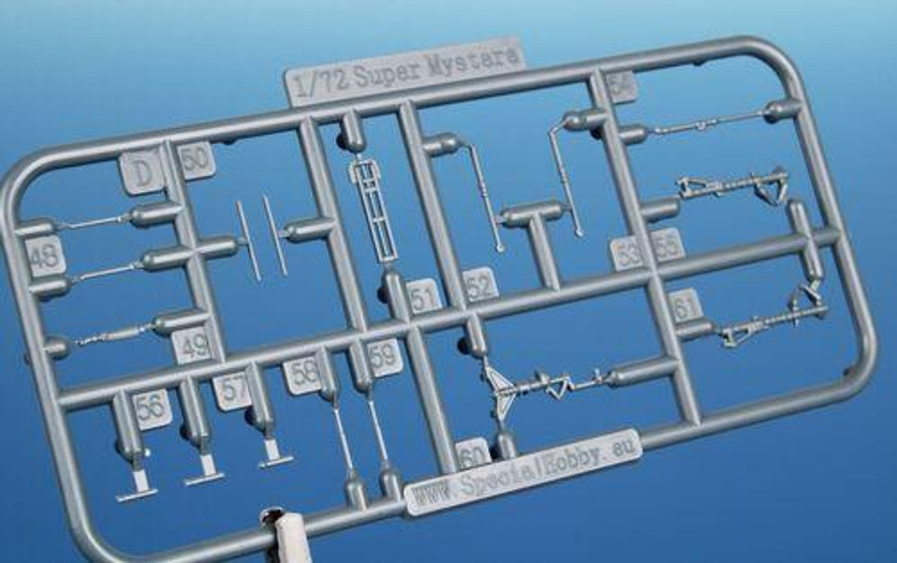 The French SMB-2 Super Mystere jet fighter became the first Western European fighter to break the speed of sound in level flight. Until the advent of the Mirage III, the SMB-2 was the most powerful French fighter. After the introduction of the Mirage III, the Super Mysteres were transferred to fighter-bomber units, where they served for a very long time. The SMB-2 was also exported to Israel. In the battles against Arab superiority, the SMB-2 proved its worth, but, like in France, they were used as fighter-bombers after the delivery of the Mirage III fighters. In Israel, the SMB-2 was modified by installing an American engine. After being decommissioned from the IAF, the remaining Israeli SMB-2s were delivered to Honduras. The kit contains mouldings with both engine variants. The decal sheet, originally used in kit SH72417, offers two Israeli machines with the original Atar 9B engine and one Israeli machine with the American Pratt & Whitney J52 engine.