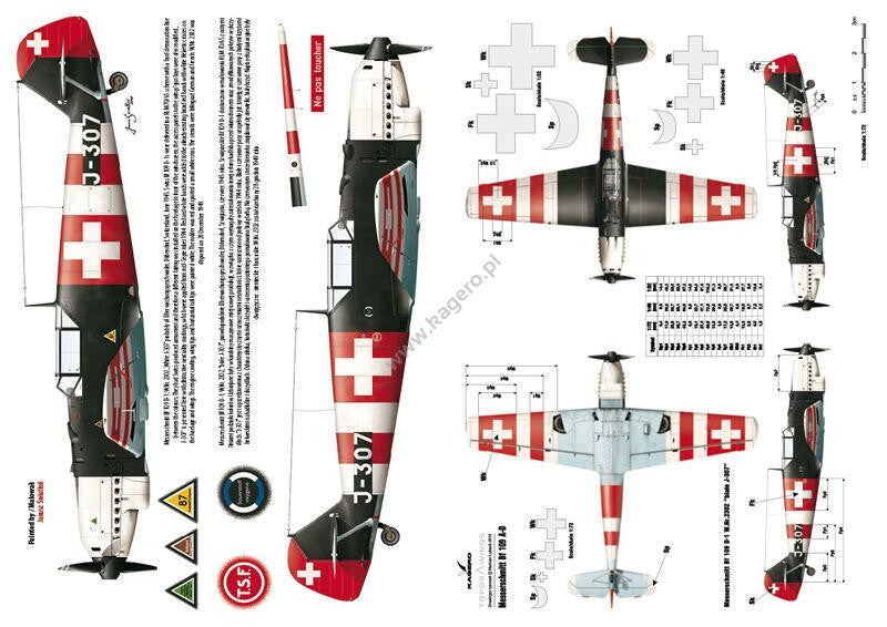 This issue of the Top Drawings series is focused on the early versions of the Messerschmitt Bf 109, powered by the Jumo 210 engines. The 28-page, A4-size booklet contains 14 sheets of 1:48 scale drawings, 9 sheets of 1:72 scale drawings (which include a specification of external changes in various versions of the aircraft), and color profiles of 5 planes, all with English and Polish captions. The drawings in 1:32 scale are attached as a folded A2-size, sheet printed on both sides. All drawings show the panel lines and rivet lines on the airframe. Also included is a decal sheet printed by Cartograf, which contains 1:32, 1:48 and 1:72 scale individual markings for the following planes depicted on color charts: