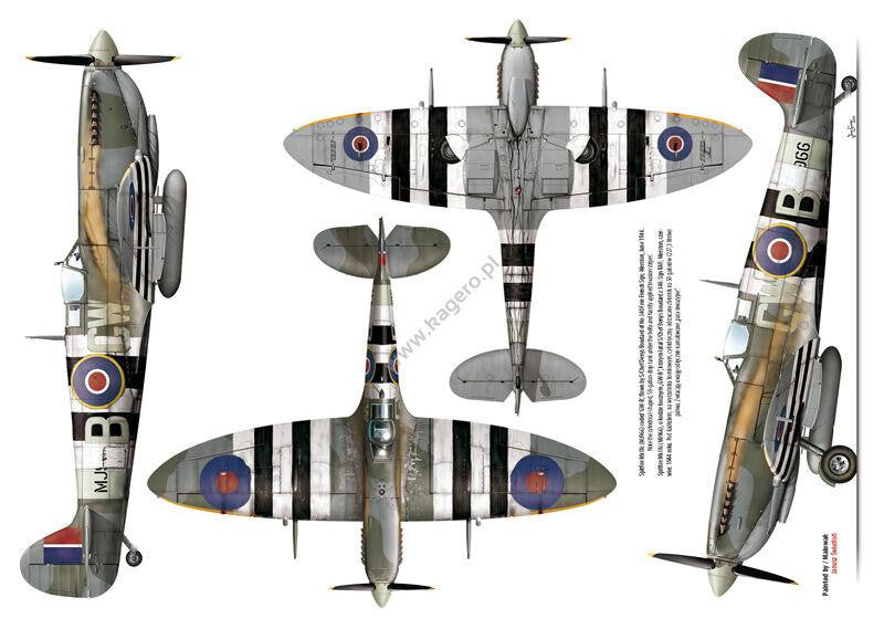 This publication is mainly devoted to the Marks IX and XVI of Supermarine Spitfire. The 20 page, A4 size booklet contains 15 sheets of 1:72 scale drawings with specification of external changes in various versions of the aircraft and colour profiles of 5 planes, all with English and Polish captions. Also attached are 3 folded A2 size sheets with 1:32, 1:48 and 1:72 scale drawings printed on their both sides. A masking foil sheet for painting the canopies of 1:32 Tamiya’s Spitfire Mk. IXc is a free addition.