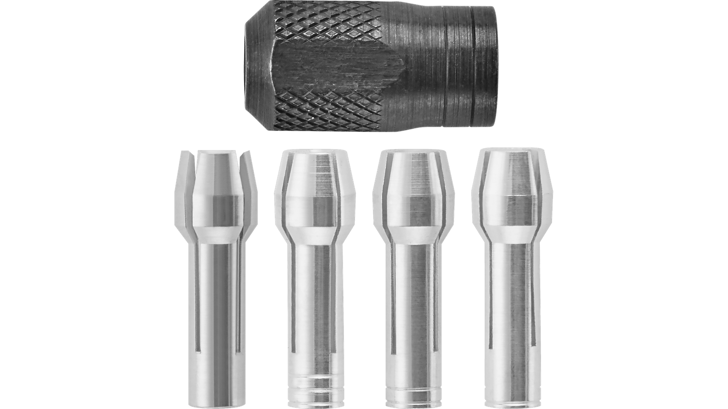- Includes one quick-change collet nut & 4 collets: 480 (1/8", 3.2mm), 481 (3/32", 2.4mm), 482 (1/16", 1.6mm), 483 (1/32", 0.8mm)