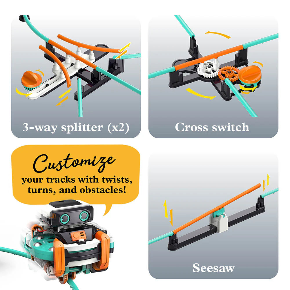 The full-color, 32-page manual guides you through a step-by-step assembly of the robot and dozens of track layouts from over 180 durable, plastic parts. Choose any of the 26 configurations in the manual or use your imagination to invent your own! Combine the snap-together track segments with the three special connectors –  the seesaw, the splitter, and the cross switch – to add twists, turns, and obstacles to your routes.
