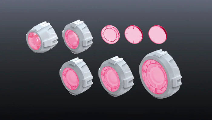 Enhance your Mobile Suit Gundam model kit collection with this Builders Parts pink sight lens set! They are molded in color, requiring little to no paint to achieve a finished look.