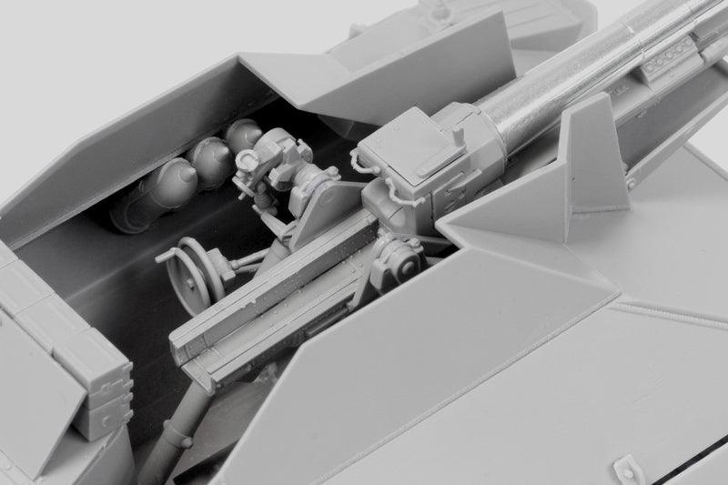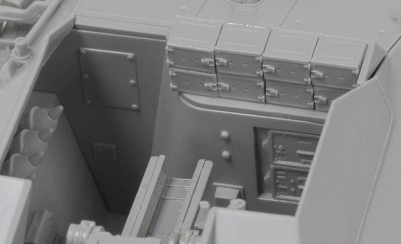 This new 1/35 scale kit is phenomenally detailed. It is far more than just a hybrid of Dragon’s Hetzer chassis and s.IG.33/2 howitzer, for this kit required numerous new parts to pull off a realistic depiction of this vehicle. The kit has a brand-new upper hull, superstructure, fighting compartment, idler wheel, storage bin and associated interior detail such as ammunition racks. Furthermore, two options are available to fit out the aft of the fighting compartment. At the rear is a new exhaust and muffler, which comes with a photo-etched guard. This self-propelled howitzer has hitherto never been available in plastic, so Dragon’s creation makes yet another Hetzer variant readily obtainable by all. As well as the regular Hetzer tank destroyer already offered by Dragon, modelers can now add this support vehicle with heavy 15cm gun to their collections.