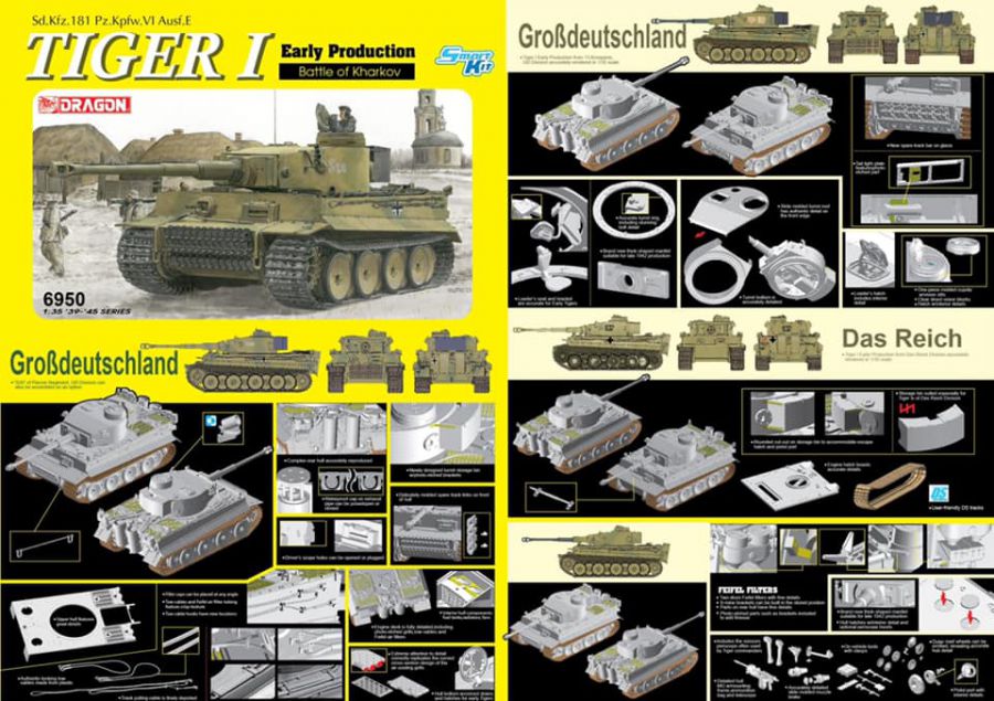 This specific kit allows a mighty Tiger I Early Production from either the elite Das Reich Division to be assembled, or alternatively a vehicle from the equally famous Großdeutschland Division. Both of these powerful units were engaged in the third Battle of Kharkov. Importantly, Tiger I expert David Byrden has provided technical assistance for development of this kit to ensure the utmost accuracy, including markings and suggested camouflage schemes drawn by himself. The kit makes use of tried-and-true parts from previous Tiger I releases, but there are brand new components too where appropriate. Furthermore, enclosed in the box is a generous selection of photo-etched parts for finer details such as engine mesh grills and brackets. These Tiger I Early-Production tanks are ready to foray into the Russian city of Kharkov to refight the battle of 1943 straight from the box!
