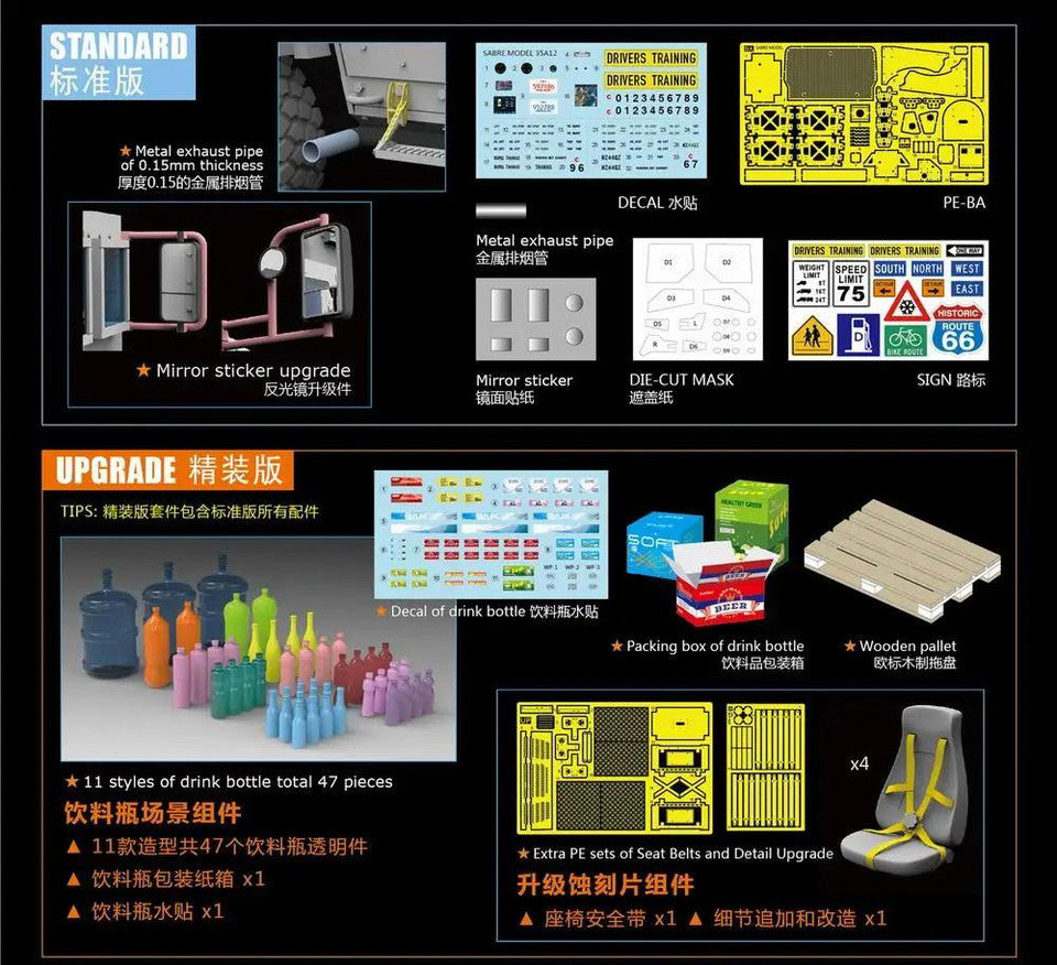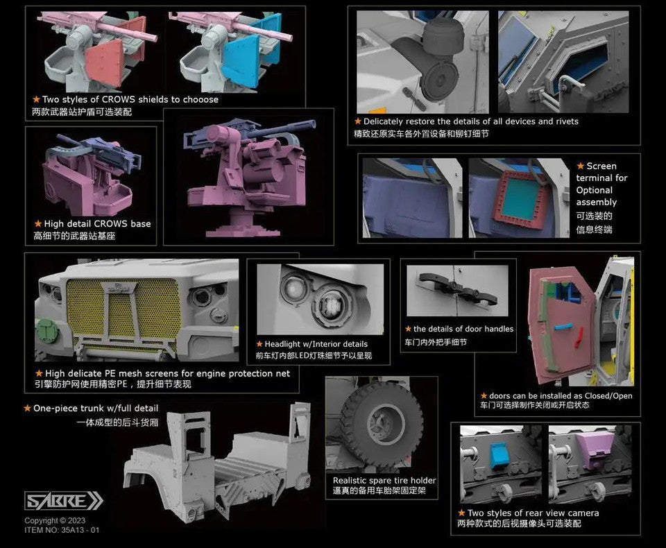 1/35 -JLTV M1278A1 M153 CROWS with MK19 automatic grenade launcher - Premium Edition Standard accessories * 5? DECAL x1, Basic PE x1, Mirror sticker x1, DIE-CUT Mask x1, SIGH CARD x1, Metal exhaust pipe x1 Upgrade accessories * 6 ? 1. Drink bottle sets: 11 styles of drink bottle total 47 pieces, 2. Drink bottle Decal x1, Packing box x1, 3. Metal antenna x1, 4. Wooden pallet x1 5. Seat Belts PE x1, 6. Detail Upgrade PE x1