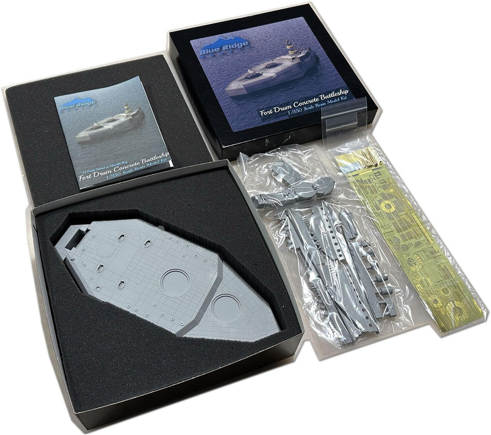 Our Fort Drum kit in 1/350 scale is an extremely unique piece of history that can be a key component of any collection! The kit includes a solid resin hull, resin parts sprues, a large 2 piece photo-etch set produced specifically for the Fort Drum, Brass Turned Barrels for the 14", 6", and 3" guns, ultra fine rigging line for the cage mast and crane, Decals for the Turret Markings, MV Lenses for the Searchlights, and full color printed instructions.