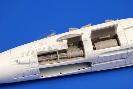 This resin cast set portrays the open rotary cannon compartment and fits the new Academy F-14A kit. The edges of the cannon box and ammo belts are made from etched brass.