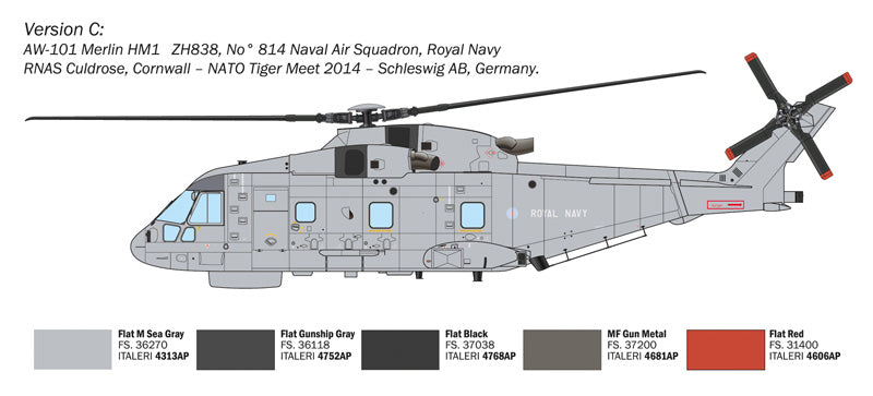 AW-101 Merlin is a medium-heavy multirole helicopter developed by AgustaWestland (now Leonardo) in collaboration with Westland Helicopters. It was designed and developed based on requirements from both the British Royal Navy and the Italian Navy to replace the now-obsolete SH-3D "Sea King." Entering service in the early 2000s, its primary role is that of an embarked anti-submarine warfare (ASW) helicopter. However, due to its operational flexibility, it is also well-suited, in its various configurations, for troop transport, maritime search and rescue (SAR), as well as combat SAR (CSAR) missions. It is capable of operating in extreme weather conditions and across all operational environments. Powered by three turbines, the Merlin reaches a maximum speed of 310 km/h and has an operational range exceeding 1,350 km.