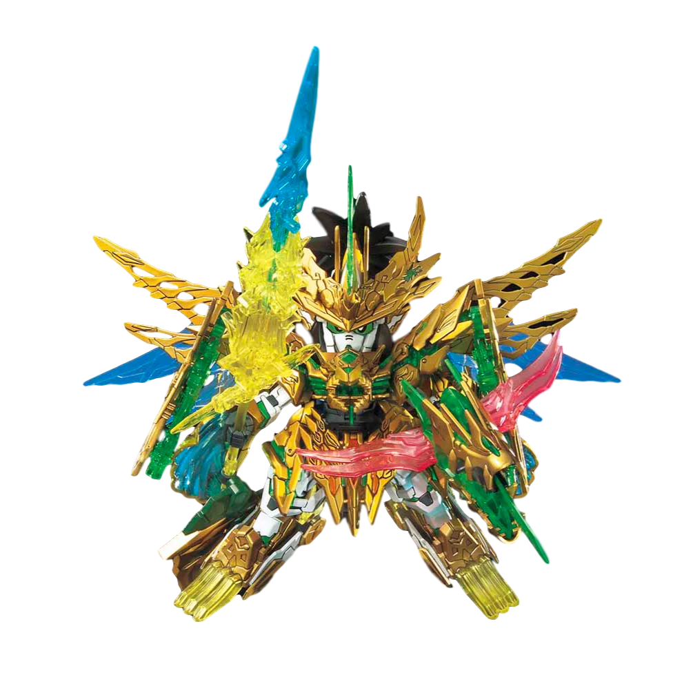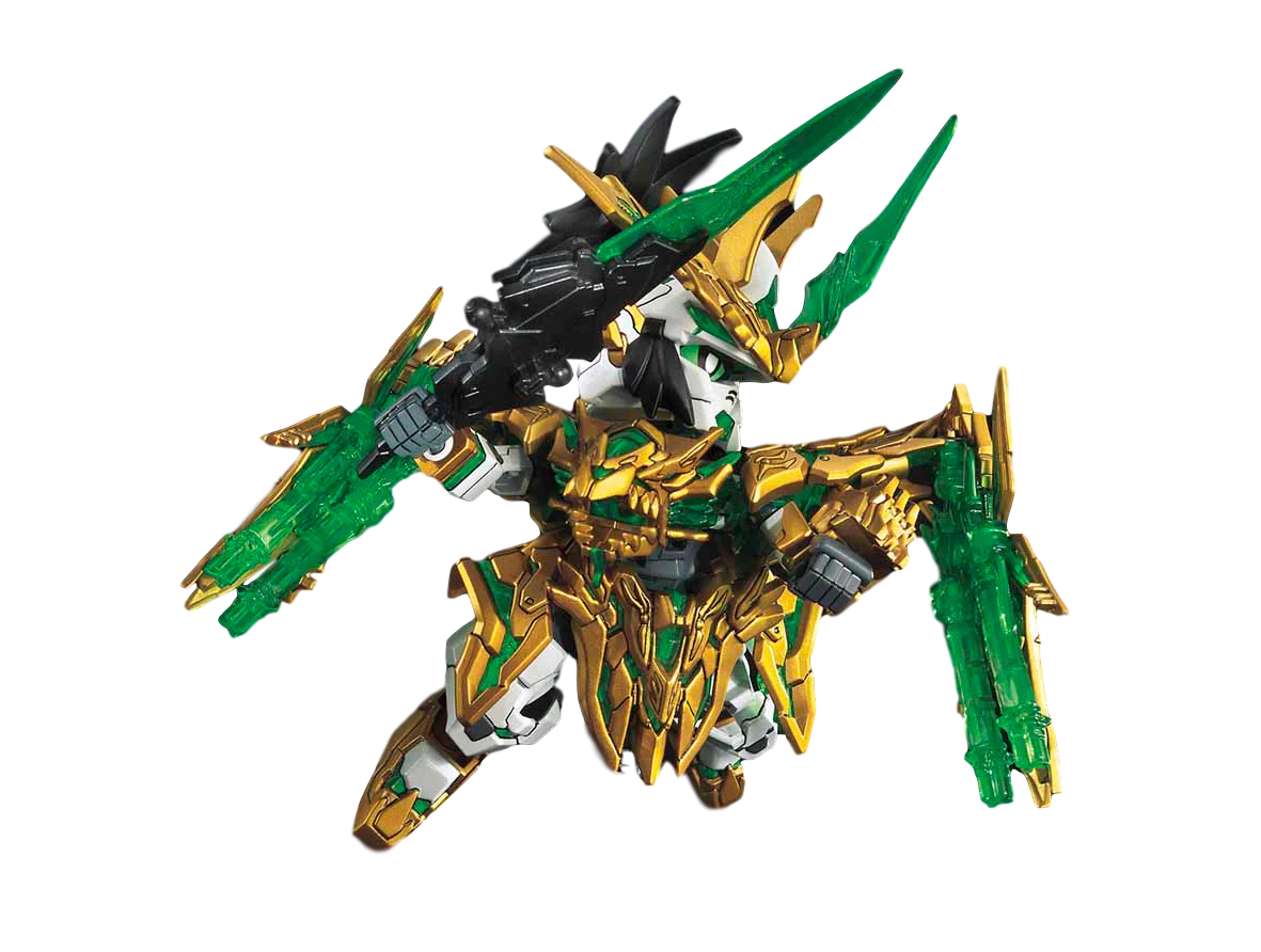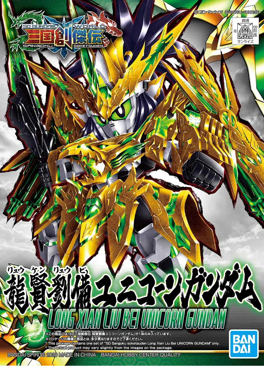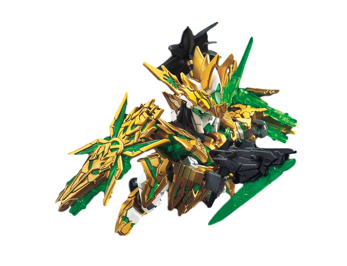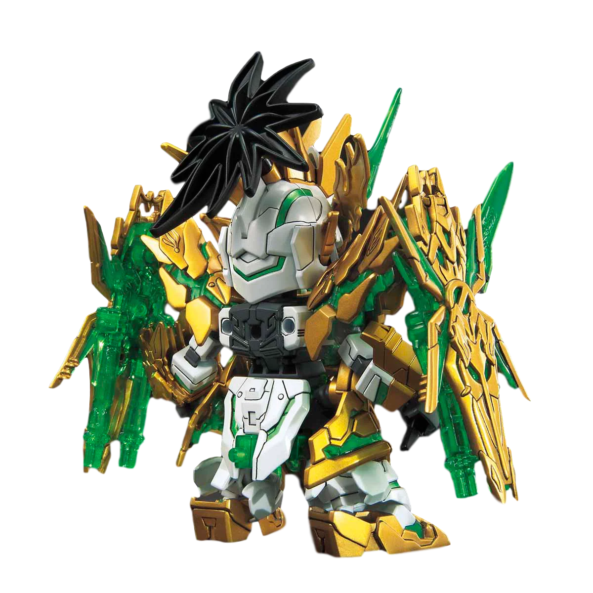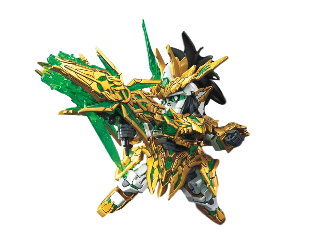 The awakened form of Liu Bei Unicorn Gundam is here, featuring updated coloring and armor! This model can be converted between sword and gun forms, as well as attached to back. Other weapon components from SD Sangoku Soketsuden kits can combine with Liu Bei!