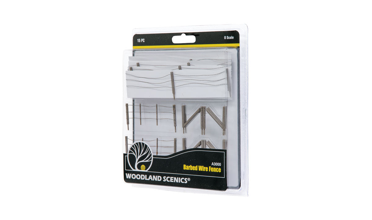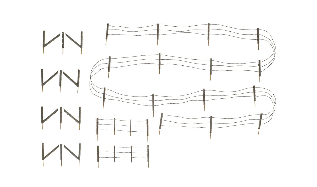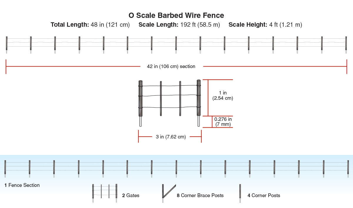 Line the edge of a pasture with handmade, pre-strung O scale Barbed Wire Fence Barbed Wire Fences come with loose corner post support pieces and feature a double-gate. Simply place the fencing around an area, and then set the planter pins, drill and glue.