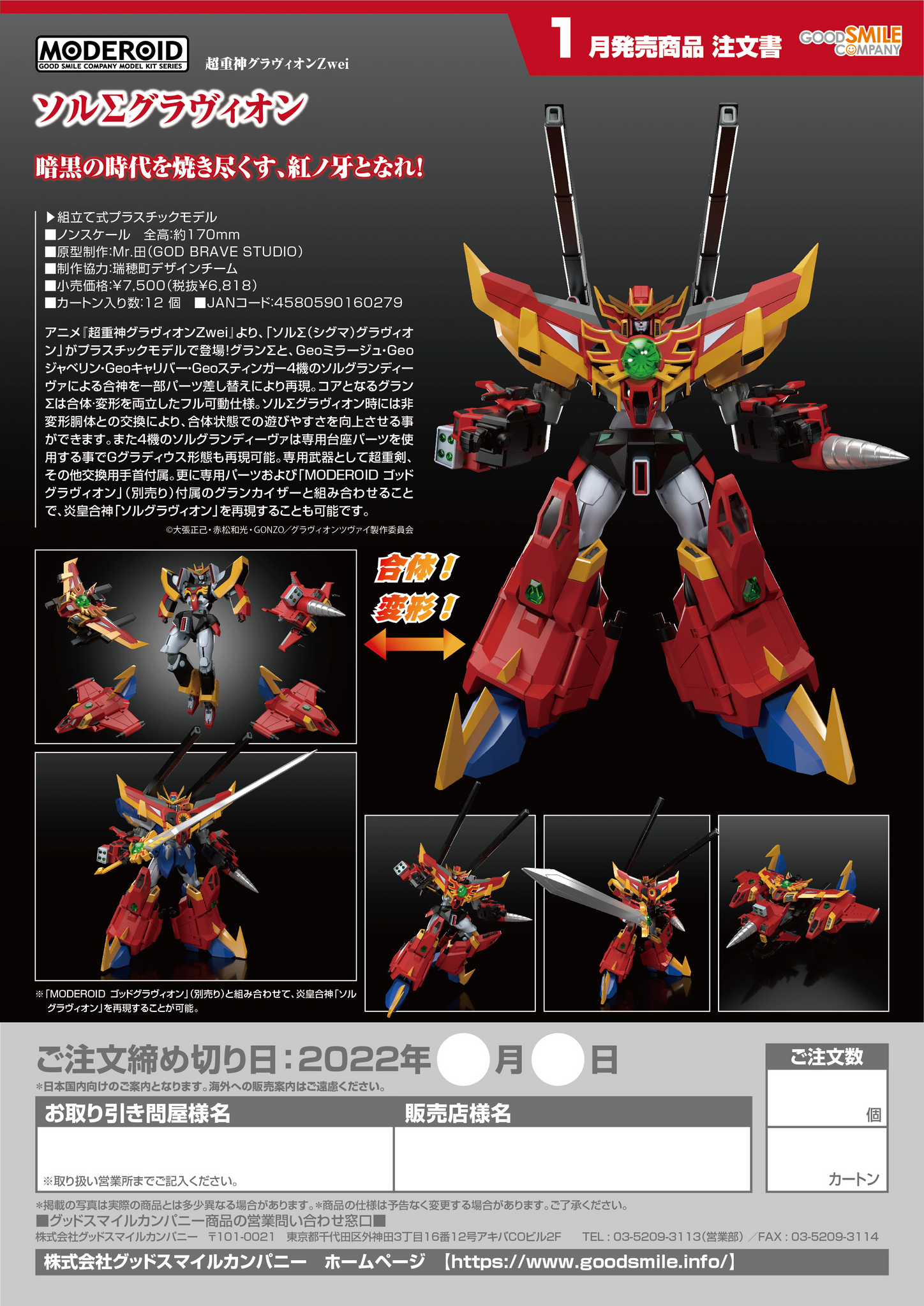 The crimson fang that burns through the dark! From the anime series "Gravion Zwei" comes a plastic model of Sol Σ Gravion! The combination of Gran Σ and the four Sol Grandivas—Geo Mirage, Geo Javelin, Geo Caliber and Geo Stinger—can be recreated with the use of interchangeable parts in certain areas. The core of the mecha, Gran Σ, is fully articulated, combinable and transformable. A non-transformable body part for displaying Sol Σ Gravion in combined form is included in order to make the model easier to move and display. Additionally, the four Sol Grandivas can be combined and displayed in their G Gladius form with the use of a special stand base. Its Super Heavy Sword weapon and various interchangeable hand parts are included. Special parts allowing you to combine it the the Gran Kaiser included with MODEROID God Gravion (sold separately) are included as well, allowing you to create the Flame Emperor Sol Gravion.