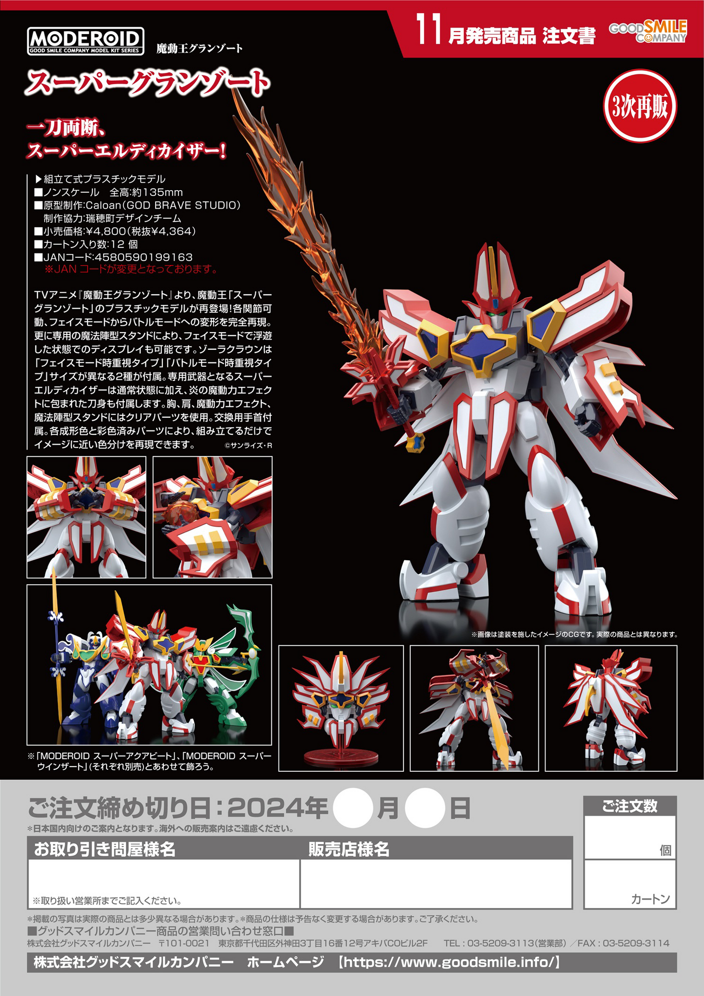 From the anime series "Mado King Granzort" comes a rerelease of the plastic model of the Mado King Super Granzort! The model is fully articulated and can be transformed from Face Mode to Battle Mode. A display stand is also included to display Granzort floating in the air while in Face Mode. Zora Crown parts in two sizes—one made for use in Face Mode, and one made for use in Battle mode—are included.
