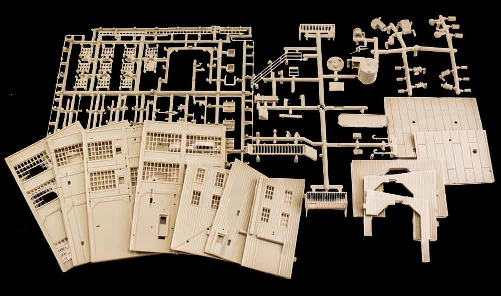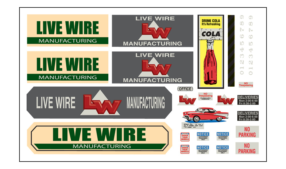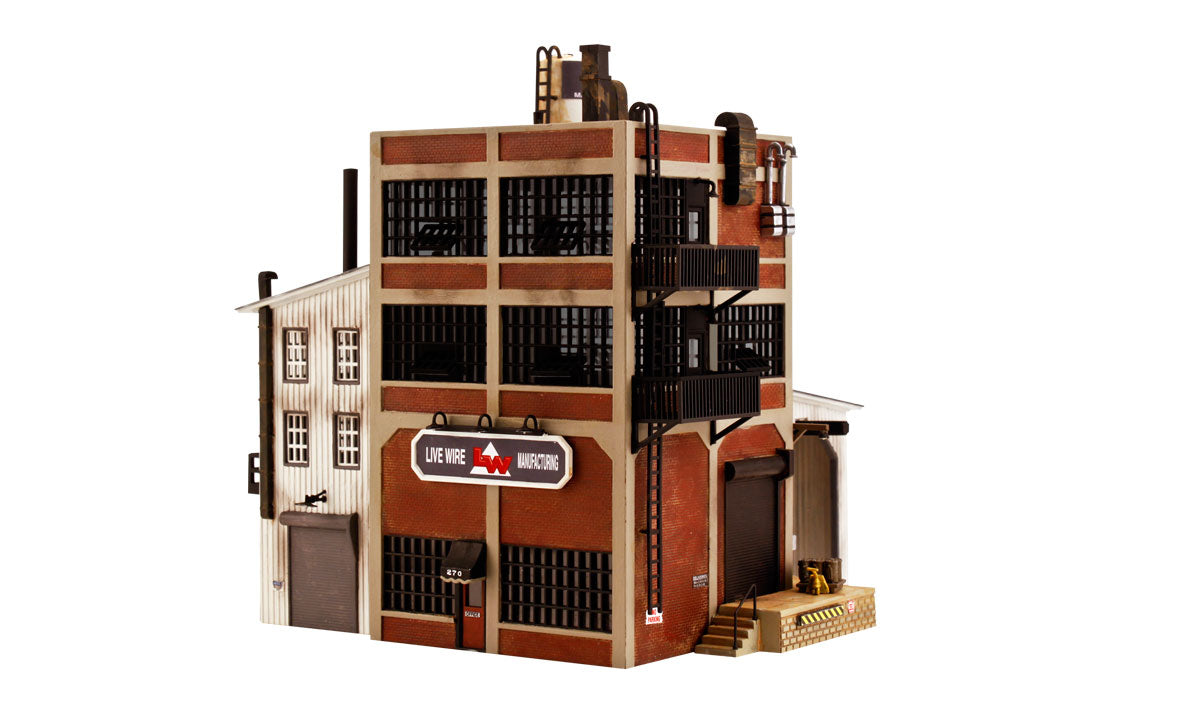 Set Live Wire Manufacturing as the centerpiece of your layout's industrial park or alongside a spur. This two-story, highly detailed structure features steel sash vented windows, full roof detail, rooftop water tower, lean-to for spur access with movable overhead wire spooling assembly, signage and more!