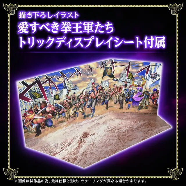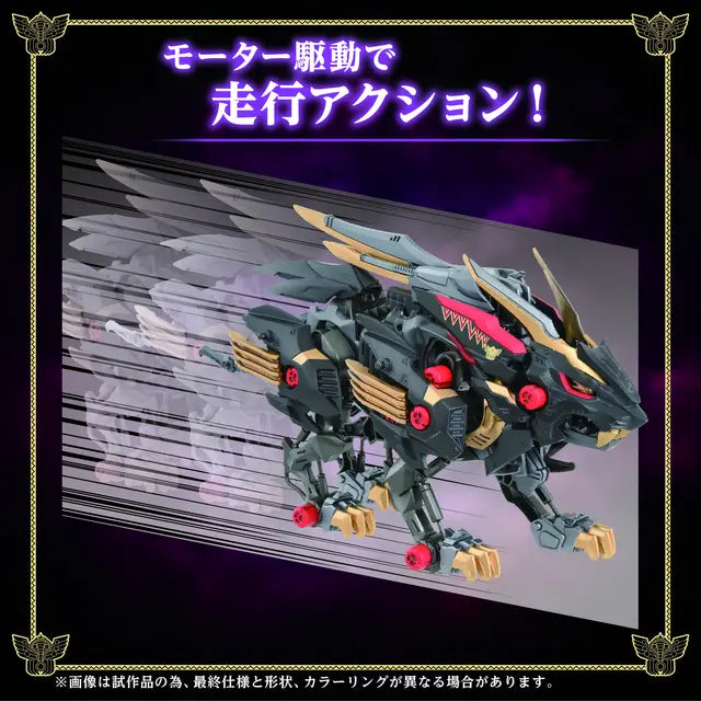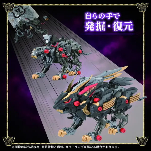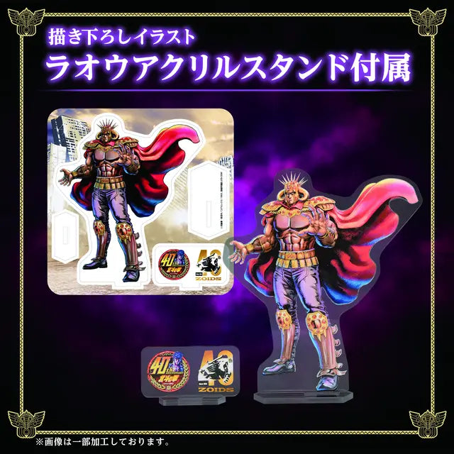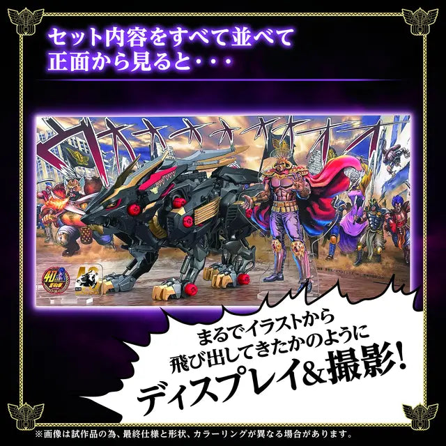 The lead Zoid Wild machine, Wild Liger, decorated to emulate Kokuoh-go from Fist of the North Star. The design not only features the color scheme but also incorporates the Army of the Fist King's mark and the distinctive triangular reins of Kokuoh-go to recreate the image of the horse. Included in the set is an acrylic stand of Raoh that can be displayed alongside the Zoid at the same scale, as well as a trick display sheet of the Army of the Fist King that makes the entire set content look like a single piece of artwork.