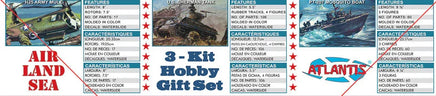 The Atlantis Air, Land and Sea set comes with 3 great kits. 1/48 scale The H25A Army Mule helicopter, 1/102 scale PT-207 Mosquito boat with 3 figures, and the 1/48 scale M4A3E8 Sherman Tank with 3 figures. Each kit is highly detailed and makes a great display. Painting and decal placement is provided on the instructions. We hope you enjoy this Hobby Set!