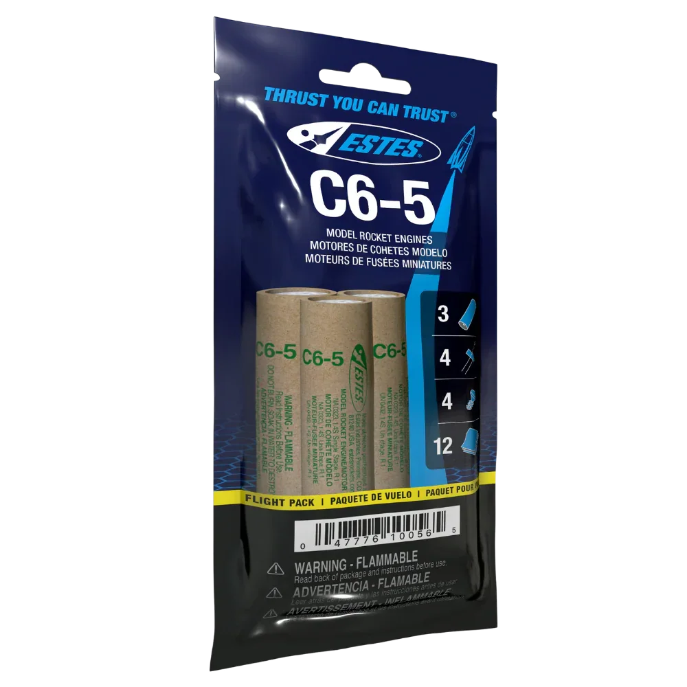 The Estes C6-5 Engine Flight Pack has everything you need for three exciting rocket launches—3 engines, 4 starters, 4 plugs, and 12 sheets of recovery wadding. Designed for rockets up to 4 oz, it’s a trusted engine for consistent, high-flying performance.