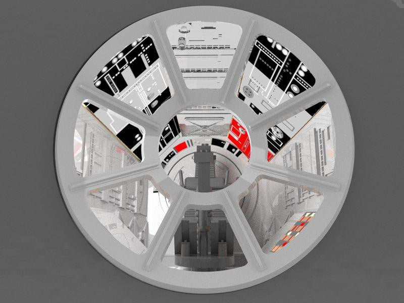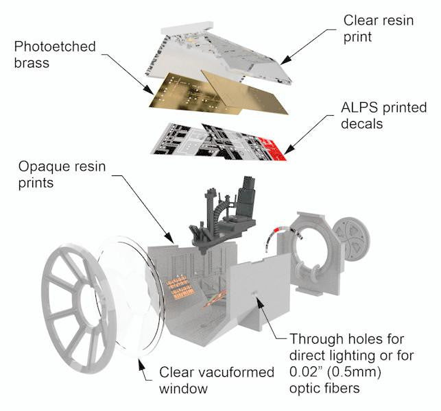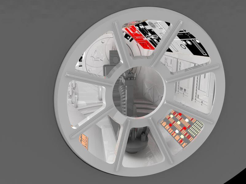 Add the missing gun port rooms to the classic MPC Millennium Falcon kit! This multimedia kit will include 3D printed parts, vacuformed parts, photoetch, and decals! Includes provisions for easy lighting — optic fiber may be used for the lower wall section, but it is not necessary.