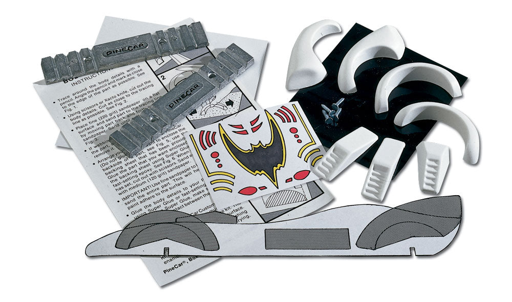 Batcar Designer Kit includes the step-by-step instructions, template and body details needed to create a three-dimensional shaped racer. Template is sized to work with a block measuring approximately 1 3/4" w x 7" l (4.44 cm x 17.7 cm).