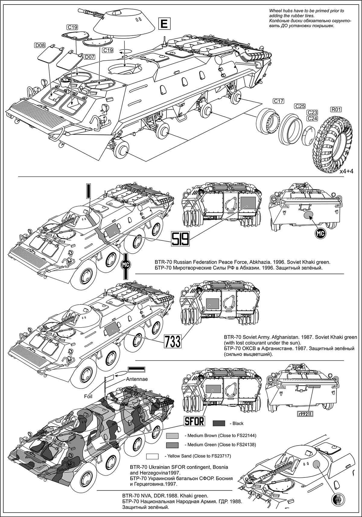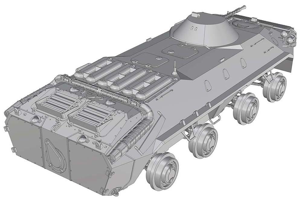 BTR-70 (early production series) - is an 8x8 armored personnel carrier, it was accepted into service in 1972 and would later be exported to the Warsaw Pact and other allies. Introduced as a successor to the earlier BTR-60, it most closely resembles a BTR-60PB, both vehicles having a roof mounted turret equipped with a heavy machine gun and a secondary co-axial PKT machine gun, but with a more powerful petrol engine configuration. Designers of the BTR-70, moved side-doors below the beltline. Like the vehicle s predecessor, it is fully amphibious with minimal preparation.
