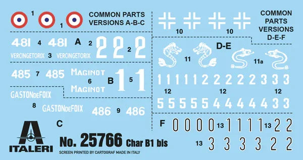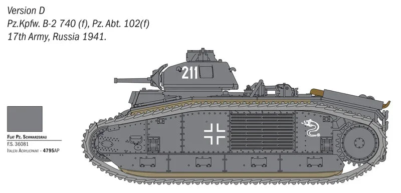 The "Char de Bataille" B1 was the main battle tank used by the French army during the Second World War. The original design was conceived in the mid-1920s (many technical solutions adopted, such as the large exposed tracks, are indeed typical of that period), but it began to be deployed to units only in the mid-1930s. Sturdy and massive, it was improved in its "bis" version to enhance performance and operational capability. It was armed with a 47mm turret cannon and a 75mm howitzer installed in a case mate at the front of the tank. Although it was generally a good tank for the period, the Char B1 bis was employed to support infantry divisions rather than in autonomous armored groups that would have provided greater operational flexibility against German Panzer divisions during the 1940 Campaign in France.