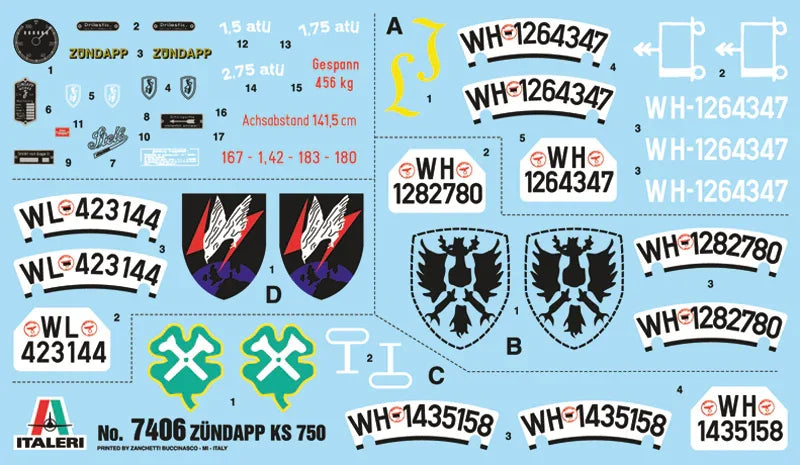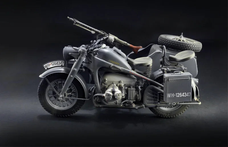 The motorcycle and sidecar Zundapp KS 750 was widely used during the Second World War by the German army on numerous battlefronts. The development, based on a specific OKH need, was set up in 1937 and rnade by Zundapp and BMW. Thanks to the 751 cc boxer twin-cylinder engine capable of delivering 26 HP, the KS 750 could reach the top speed of 95 km/h. For the gearbox was adopted a “four speed” lay-out with the reverse gear. Together with the BMW R75, with which the KS750 shared many technical components to improve the easiness of maintenance and availability of spare parts, it was used to perform a wide variety of duties from transport to reconnaissance. For several duties it was substituted very soon by the Kubelwagen, more practical and easy to produce and maintain. It could be armed with a MG34 machine gun installed in the sidecar's boot.