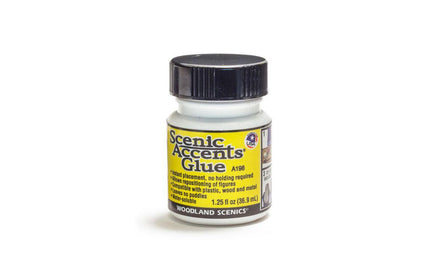 Scenic Accents Glue is specially formulated for instant placement of figures with no holding required and allows for easy repositioning. The no-drip, no-mess adhesive dries clear with no puddles or residue. Water soluble, high-tack, and compatible with plastic, wood, and metal.