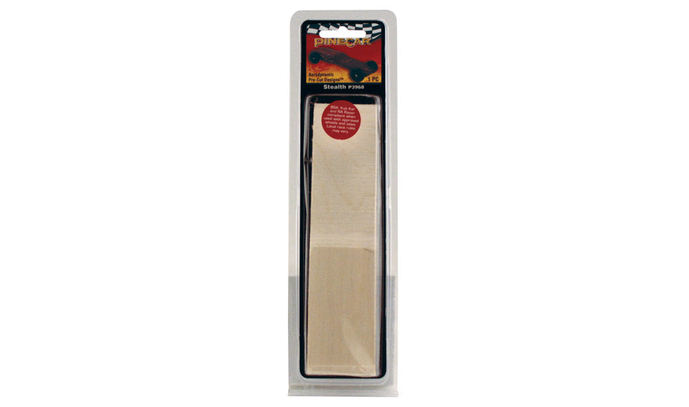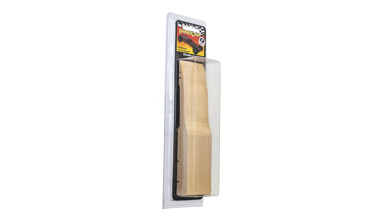 Low profile and aerodynamic, the Stealth is geared toward speed. PineCar round and cylinder Weights fit the pre-drilled weight cavities. There are extra grooves for optional extended wheel base. The Stealth is a rough-cut and ready-to-finish block for those who want a great racing car but may not have the necessary tools or skills.