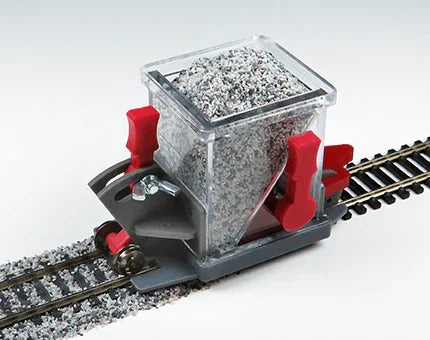 Ballast the easy way with this handy tool.  It can be towed or pushed by your locomotive for steady and even application. Adjustable height settings allow you to choose ballast depth and thickness and adapt to any code rail (Code 100, 83, 75, etc.). The shutoff valve lets you stop ballast flow when you want to move the spreader to different areas or when it reaches the end of the track.