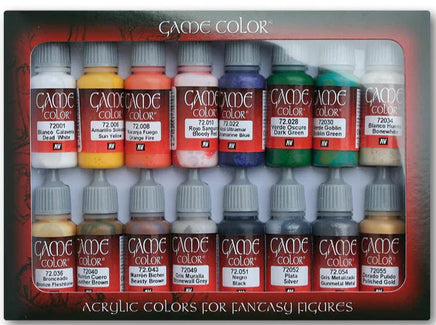 Set of 16 Game Color references for painting models and miniatures. Contains 17 ml./0.57 fl.oz. bottles and a color chart.