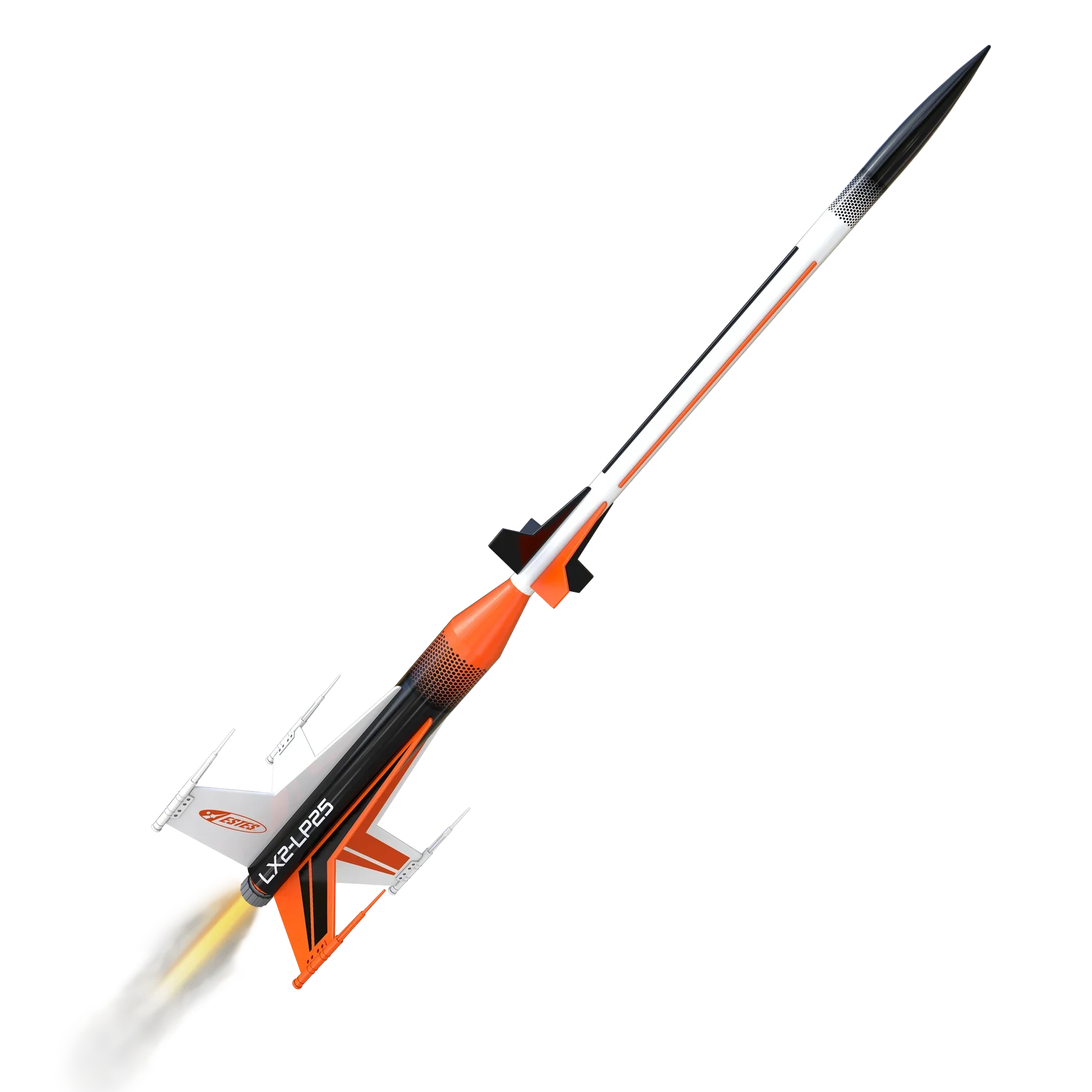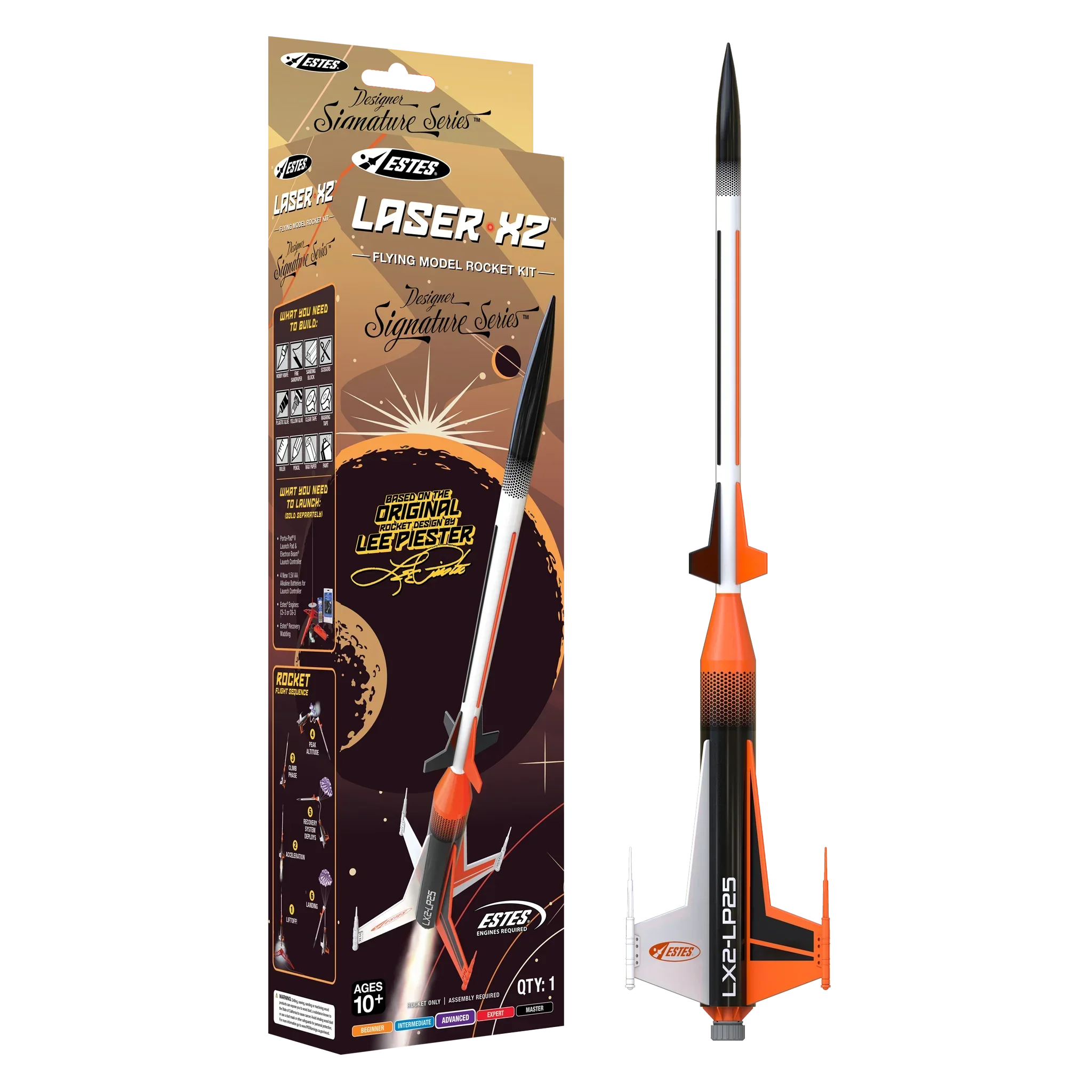 With its intricate fin tip details, distinctive boat tail, and redesigned decals, the Laser X2™ soars up to 450 feet on recommended C5-3 or C6-3 engines before deploying a 15-inch parachute for a smooth recovery. More than a rocket, it’s a hands-on tribute to exploration and innovation.