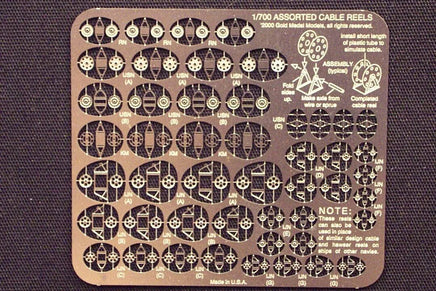 A set of 48 cable reels in twelve styles, four reels of each style. Includes USN, IJN, RN, and KM designs. Relief-etched in 3-D for extra detail. Stainless steel.