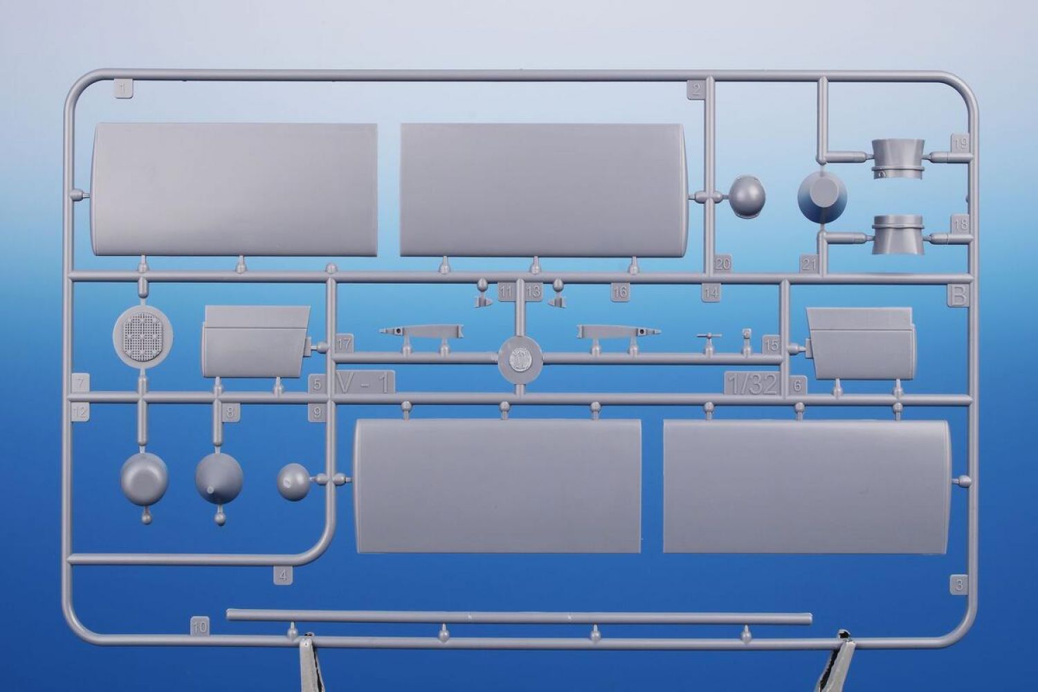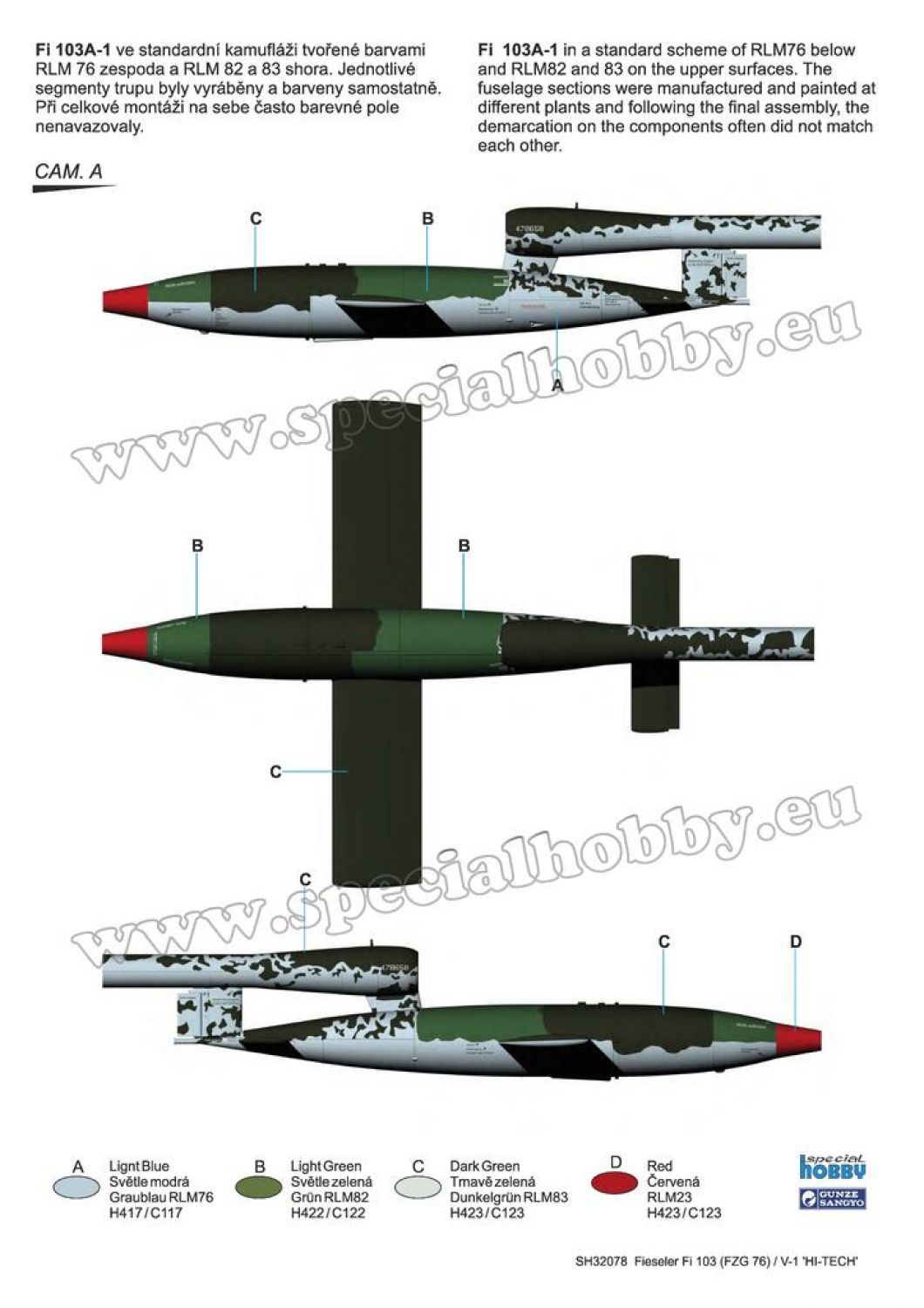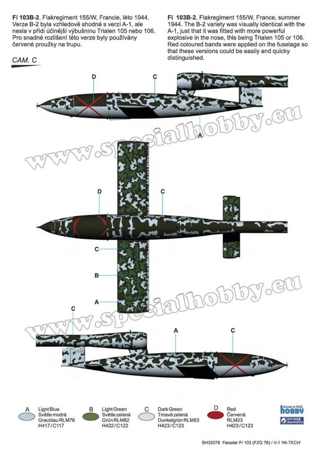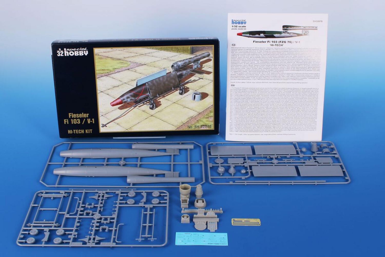 Model of the German unmanned missile which was used in the offensive against the UK. Following the Allied invasion to France, the missiles were aimed at Antwerp, Liège and Brussels too and launched from land-based sites or from flying aircraft. The kit contains three grey styrene sprues, a decal sheet, photo-etched fret, superbly detailed resin cast parts of the pulse jet engine and full colour instruction manual. The decals cater for four machines.