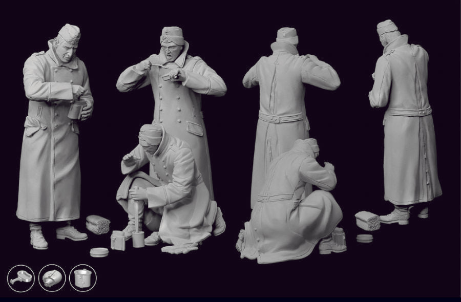 The three soldiers are well sculpted in greatcoats and caps, suggesting an autumn or winter scene somewhere on the frontlines. Two crewmen are digging into the mouthwatering contents of their mess tins, while another is attempting to open a can with his bayonet. The set’s accessories such as a loaf of bread and canned food will prove valuable for all manner of diorama scenes. This domestic-looking set fills a gap in the range of plastic figures currently available on the market. Modelers will doubtlessly find this set appetizing as a standalone vignette or, alternatively, with the contents mixed and matched in a larger diorama. Serve it up, Dragon!