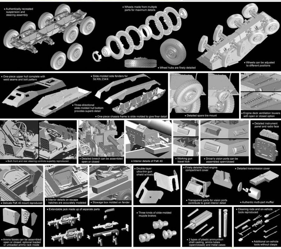 Germany created a number of successful schwerer Panzerspahwagen (“heavy armored reconnaissance vehicles”). An important family of vehicles in this class was the Sd.Kfz.234. Design work commenced in August 1940 and the Sd.Kfz.234 had four distinct variants, the last of which was the Sd.Kfz.234/4. It is this 8-wheeled vehicle that is the subject of Dragon’s newest 1/35 scale plastic kit. Reflecting the state of the war by that stage, this 6m-long vehicle was more of a tank hunter than a reconnaissance vehicle. It boasted a complete 7.5cm PaK 40 L/46 anti-tank gun installed in the open-topped fighting compartment, though the gun’s traverse was limited to 12 either side. Only 89 vehicles were produced by Bussing-NAG between December 1944 and March 1945, but they were employed on both the Eastern and Western Fronts.