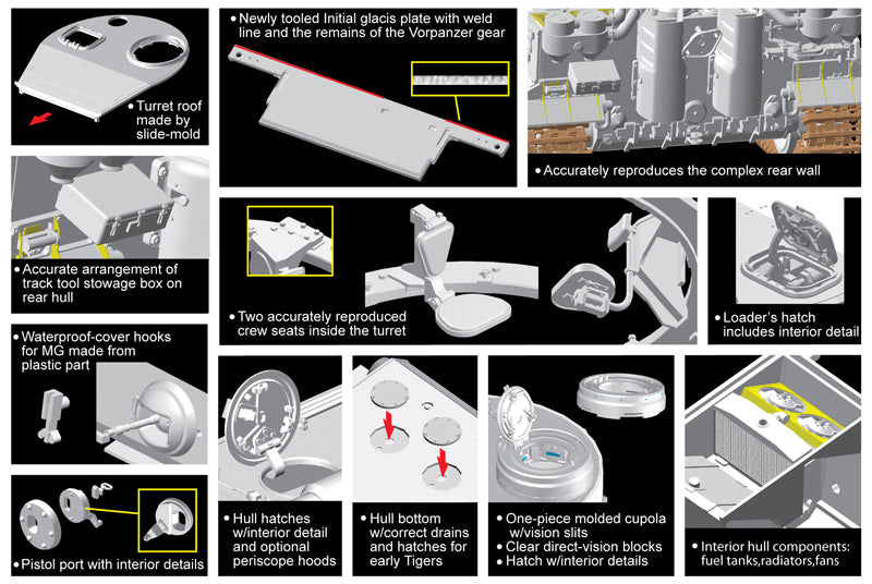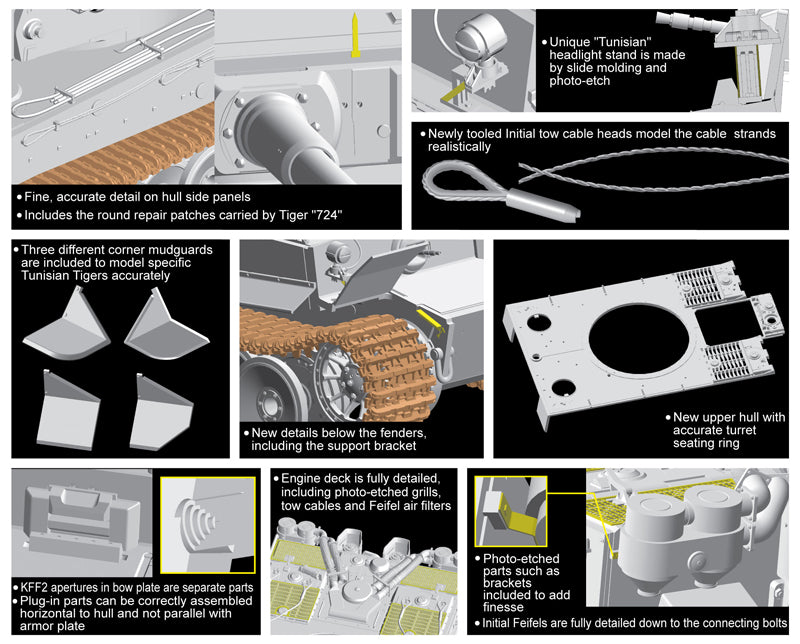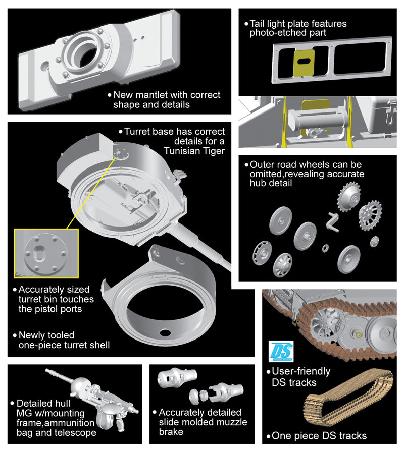The Tigers of the 501 Heavy Battalion led several battles against American, British and French forces, including Sidi Bouzid. Sent to Tunisia in November 1942 to bolster Rommel’s army, they inspired “Tiger phobia” in the allied tank crews. Whether in the open desert of the south, or the hills and farms of the north, they were a decisive weapon. These Tigers with their outsize turret numbers, their green “tropical” camouflage and their prototype equipment, have a unique appearance. Dragon has incorporated new research into this model, accurately reproducing the most famous veteran Tigers of the 1st Company.