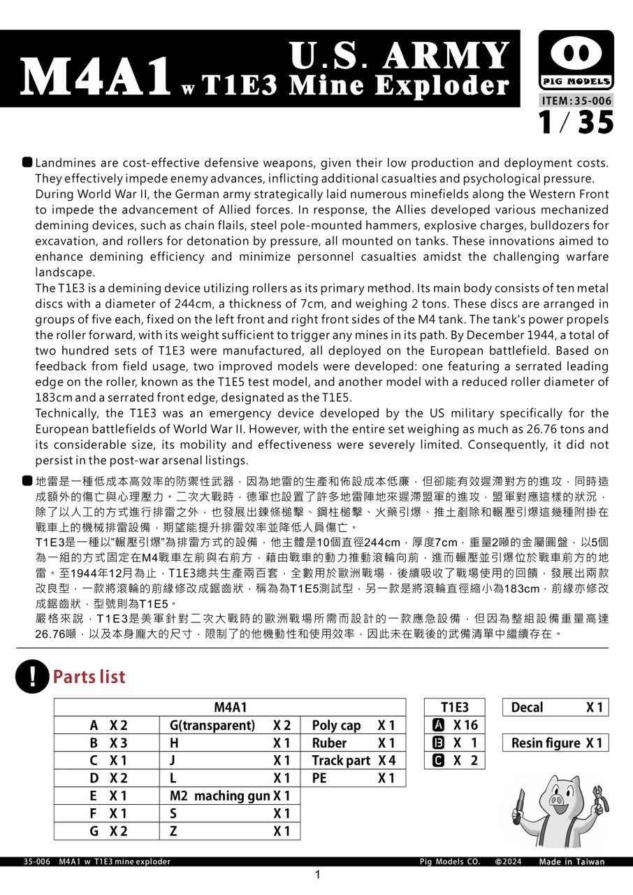 1/35 Pig Models M4A1 Sherman w/ T1E3 US Army Mine Exploder Plastic Model Kit 35-006