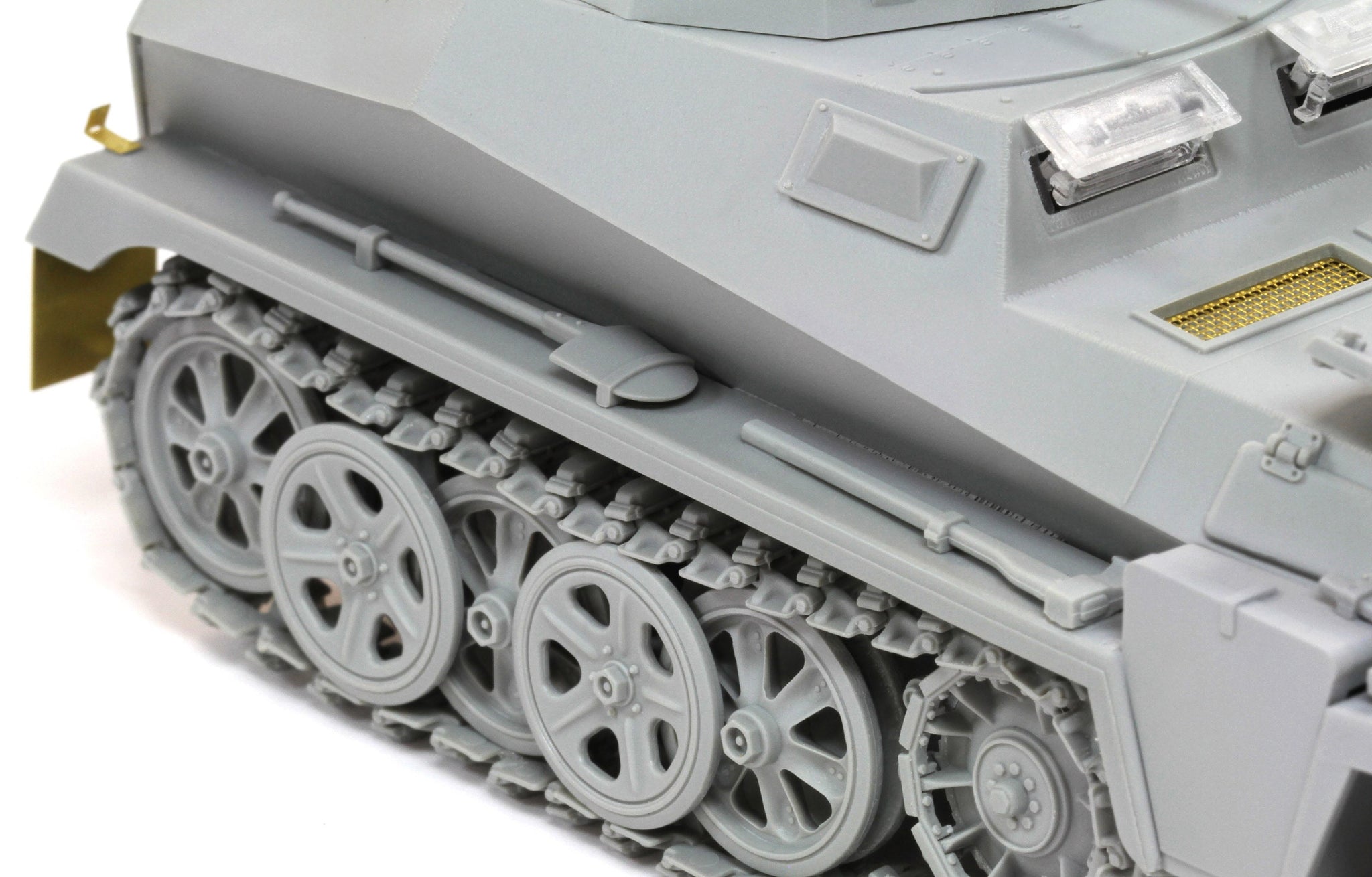 Dragon is offering a fine 1/35 scale kit of the Sd.Kfz.250/9 Ausf.A le.S.P.W. (2cm) as a complement to its formidable Sd.Kfz.250 family lineup. The le.S.P.W. was a reconnaissance halftrack fitted with a 2cm KwK 38 cannon and a coaxial machine gun in an open-topped turret. The original Ausf.A halftrack featured the same turret as the Sd.Kfz.222 armored car, while the newer Ausf.B adopted a different Hängelafette 38 turret. Several Sd.Kfz.250/9 halftracks were sent to the Russian Front in July 1942 for evaluations, with mass production commencing later. Indeed, the type proved successful and this halftrack variant came to succeed the Sd.Kfz.222 thanks to superior cross-country mobility. To create this variant, there are a number of brand-new parts. These include a newly tooled turret – the complex shape had no less than ten armored faces – to accommodate the 2cm cannon and machine gun, plus the new photo-etched mesh for the turret top. This particular turret has no vision blocks. The FuG 12 radio and turret basket are also new for this item. Although the turret may be small, it’s very complicated, yet it has been faithfully recreated in this kit. To fit the turret, the upper-hull plate was extensively modified as well. As part of Dragon’s facelifted Sd.Kfz.250 series, Dragon’s famous Magic Tracks are available. The Sd.Kfz.250/9 was a small vehicle, but this effective reconnaissance vehicle is now ready to commence patrols on modelers’ dioramas!