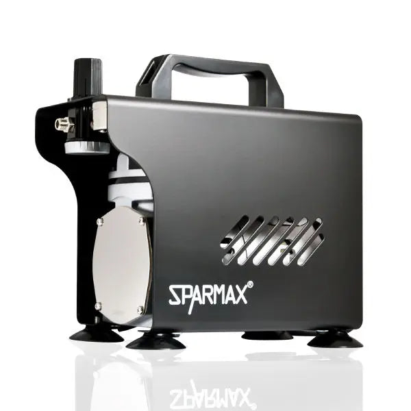 The Sparmax AC-501X Mini Air Compressor (product number 63856) is a stylish, zero-maintenance, oil-less piston compressor housed in a durable metal case, designed for a variety of airbrushing applications including scale modeling, hobby crafts, makeup, nail art, and temporary body tattoos.