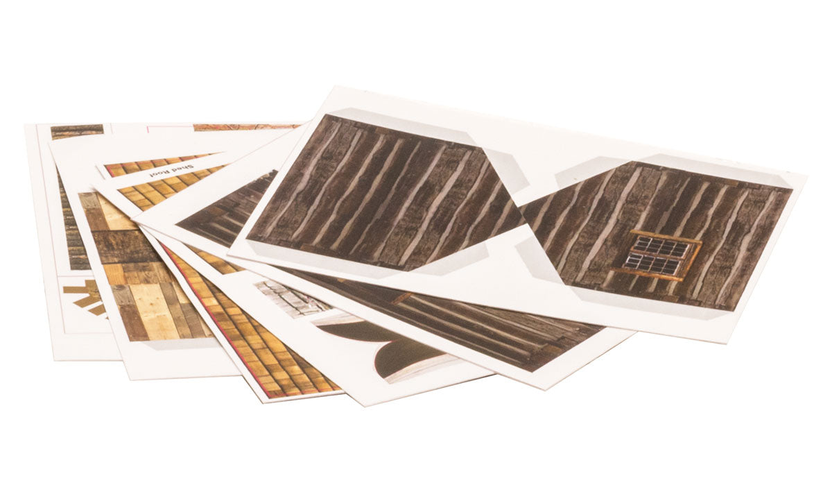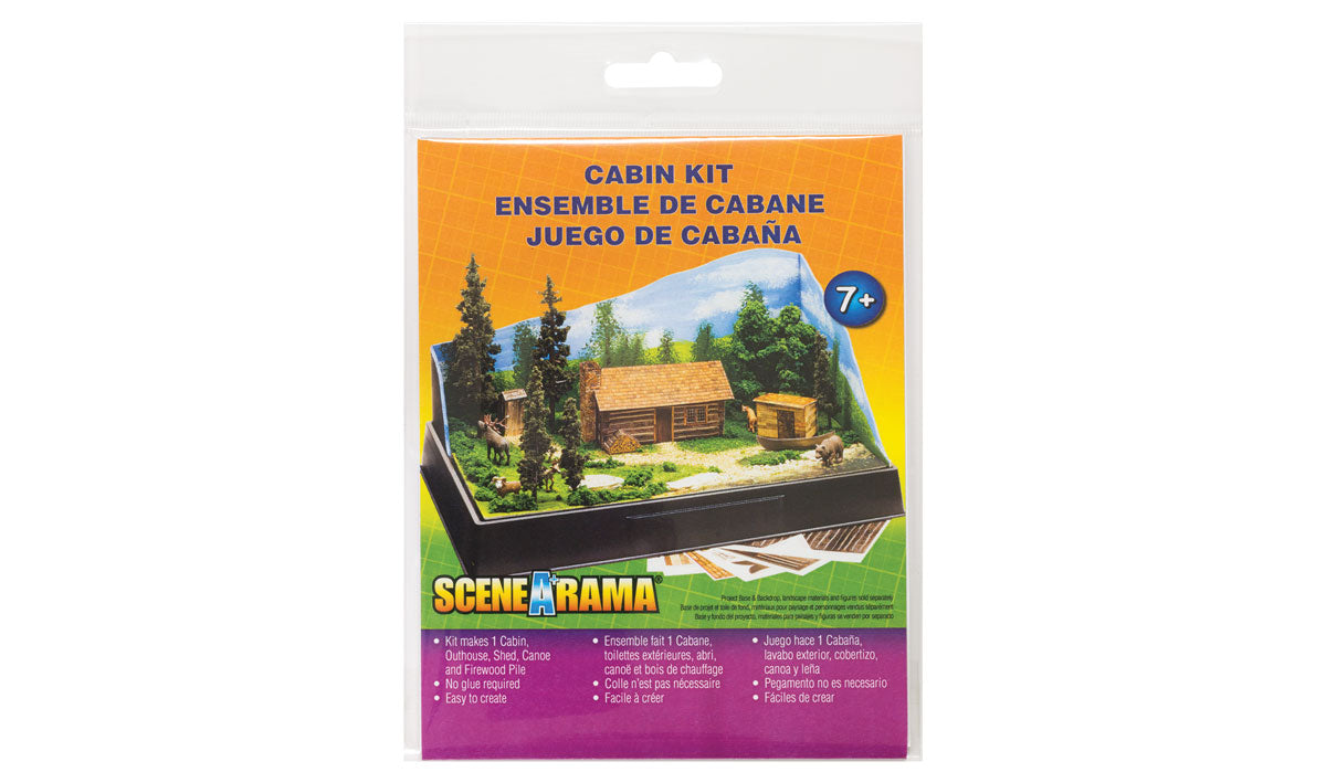 Pre-cut graphics and materials to make a cabin with a stack of firewood outside, an outhouse, a detached shed and a boat. Kit contents are easy to assemble.