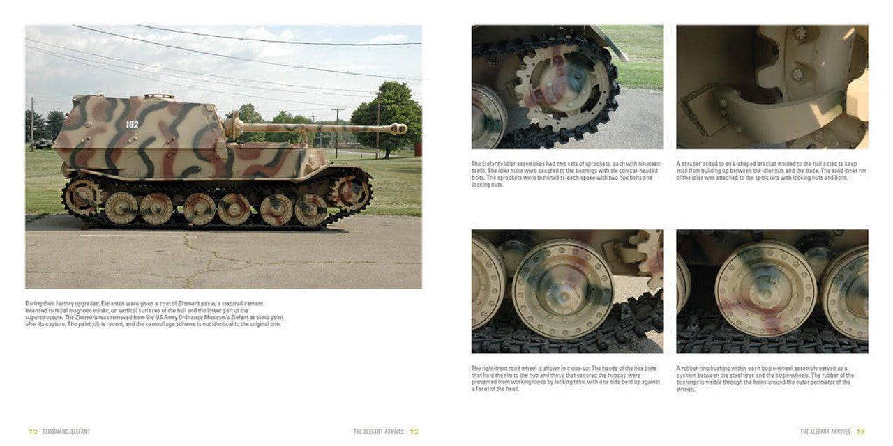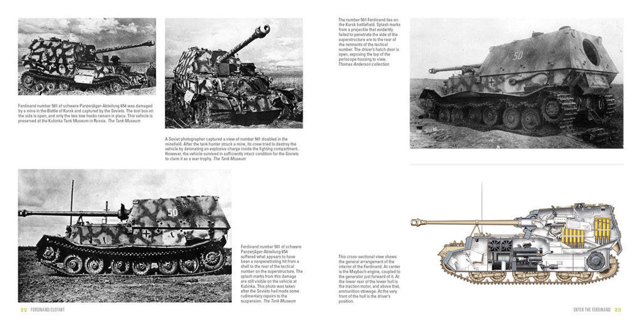 The Panzerjäger Tiger (P) was a powerful tank destroyer fielded in small numbers by the Wehrmacht. As indicated by the Panzerjäger Tiger (P) name, this series of 90 vehicles was based on an early design of the Panzer VI Tiger tank, specifically the unsuccessful tank design prototype by Ferdinand Porsche. In fact, as initially fielded, the series of giant tank killers was given the name Ferdinand. After disappointing performance at Kursk, the 48 surviving Ferdinands were returned to the factory for rebuilding and modification. Shortly thereafter, the name of the vehicles was changed from Ferdinand to Elefant. Through vintage photos, this new volume illustrates the combat history of both the Ferdinand and Elefant, additionally providing background information illuminating the development of the ill-fated Porsche Tiger design. The 100 vintage photos are augmented by over 110 full-color photos of the only two surviving examples, illustrating the nuances of the construction and wartime modification of these formidable tank destroyers.