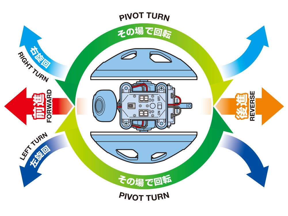 - Operate this Rolling Robot with the included Infrared Remote Control Unit (infrared remote controller and receiver). The robot has one motor each for right and left wheels, and offers the following motion: forward, reverse, right and left turns and pivot turns.