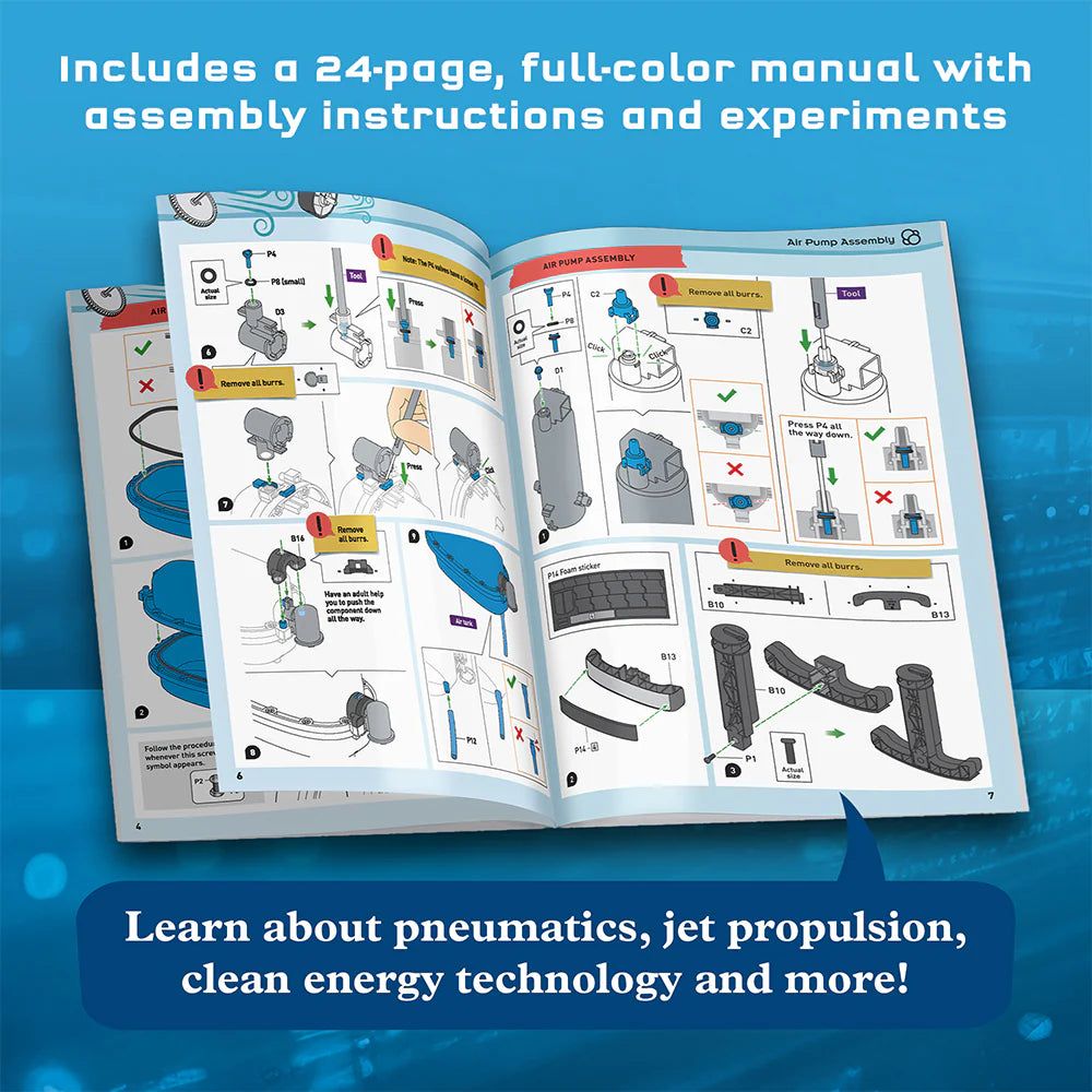Build a lightning-fast race car powered by nothing but air — no batteries or electric motor required! Use the sleek, integrated pump to compress air into the tank, then put the car on the ground and watch it zoom away! The innovative air-powered engine works just like a combustion engine in gasoline cars, minus the burning of fossil fuels. The engine intakes pressurized air from the tank, which pushes the piston forward. The piston knocks against the valve, releasing air into the cylinder, which pushes the piston down, rotating the rear axle of the car. The piston expels the air from the cylinder, creating a puff of exhaust and a real engine sound. Vrooom! Vrooom!