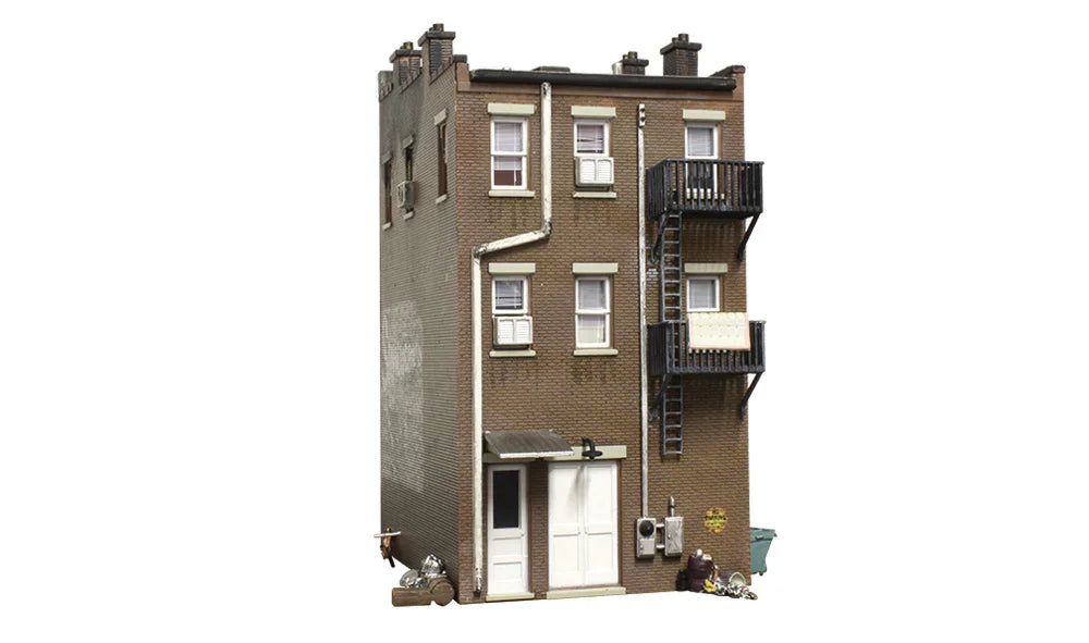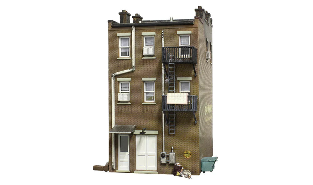 Betty's is a great building to use at the center of an action-packed layout scene. This three-story brick building includes flickering lighting effects that effectively create the illusion of an actively burning building. Custom painting and weathering add the finished touch of a scorched look. There are loads of details and scene-setting accessories, such as signage, a bicycle leaning up against the side of the building, dumpster, wrought iron fire escapes, window treatments and lots more!