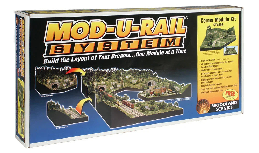 Build the model railroad layout of your dreams one module at a time with this comprehensive Corner Module Kit from Woodland Scenics. This versatile system allows you to assemble and bolt modules together end-to-end or side-to-side, creating a 36" x 36" corner or square module that forms the foundation for professional-quality scenery.